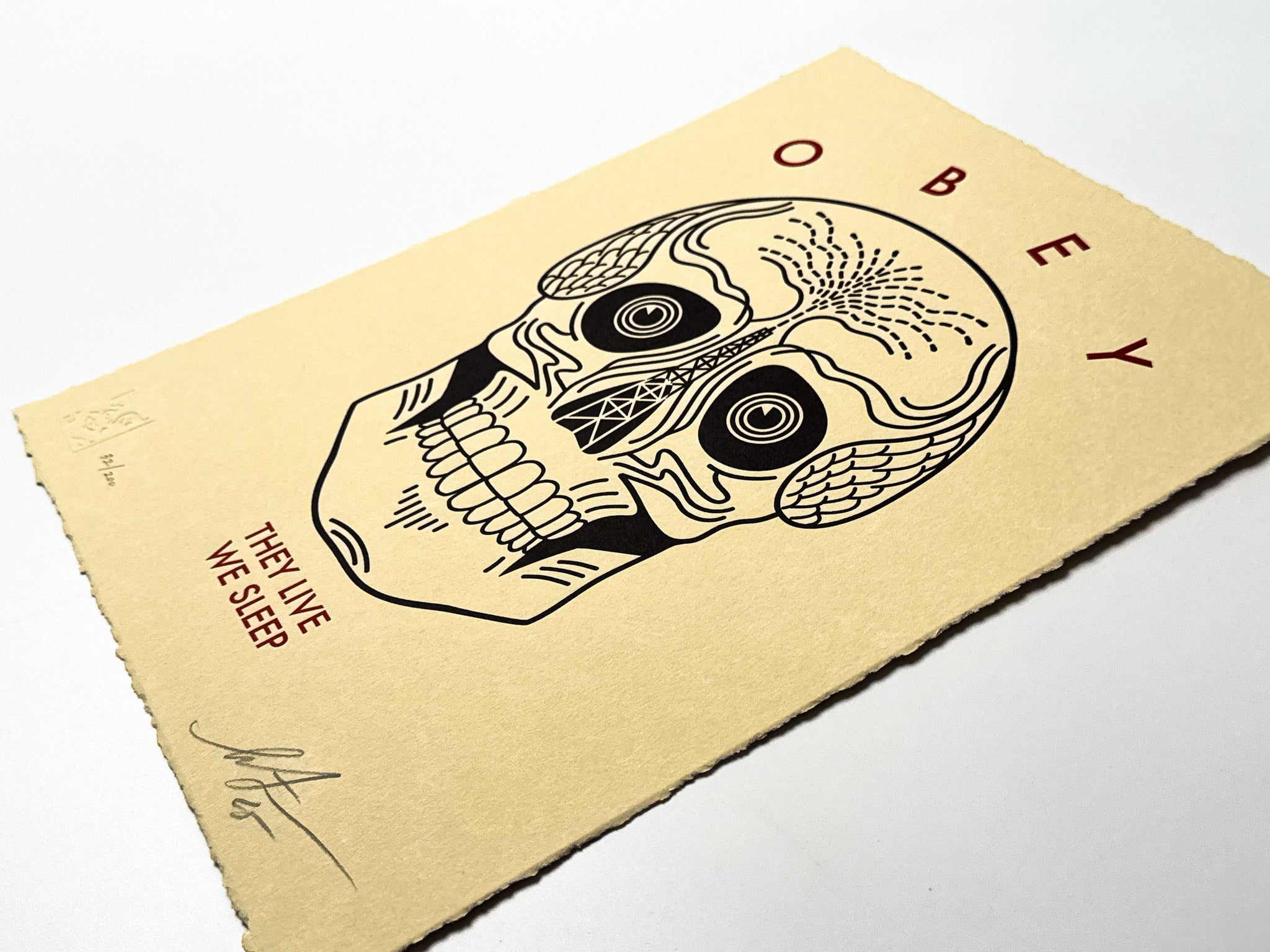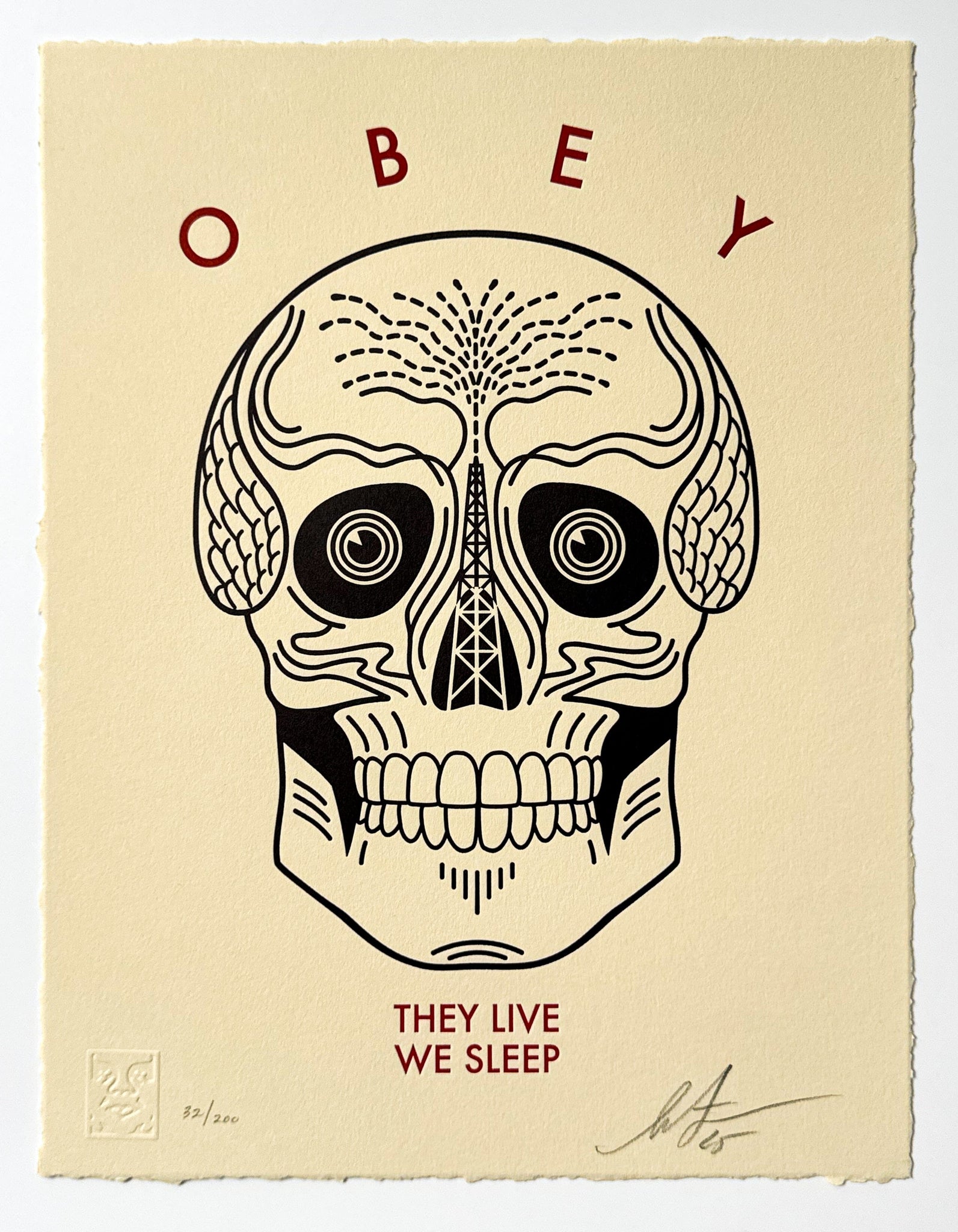"The “They Live We Sleep” letterpress is inspired by several things. My original interest in skulls came from their recurrent presence in skateboard and punk rock iconography of the 80s. Especially the Powell Peralta “Bones Ripper” illustrated by Vernon Courtlandt Johnson. I was also a big fan of Lance Mountain’s and Ric Clayton’s skull drawings for Suicidal Tendencies. Skulls were also a prominent part of the alien ghoul characters in the movie “They Live,” which inspired my use of the word OBEY in my art. Graffiti on a wall in the movie “They Live” said “They Live We Sleep”. That graffiti basically summed up the premise of the film… that the powerful get away with nefarious acts and manipulation because we are not conscious enough of what is really going on. In the case of this letterpress print, I’ve pulled from all of those influences and added an oil derrick in the forehead of this particular skull to focus on the (in my opinion) greatest threat to our health and the planet’s health. Regardless of what corporations and science deniers say, those of us with a conscience can’t sleep on climate change and environmental peril! Thanks for caring!"