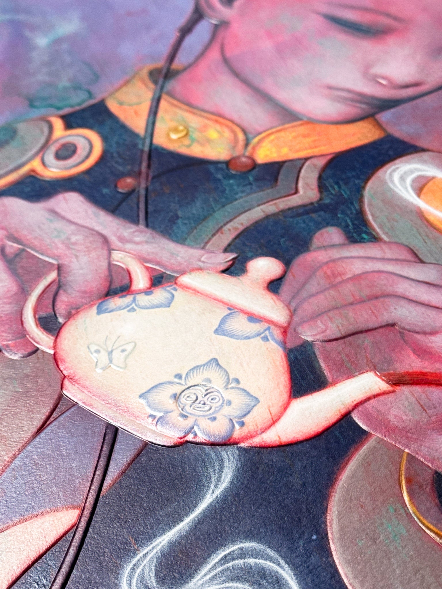 In addition to the distinctive embellishments in the multiprocess printmaking practice of James Jean and Brad Keech, the delicate tendrils of steam in the image are printed in 3D onto the paper and breach the border, adding new dimension to the painting and narrative."