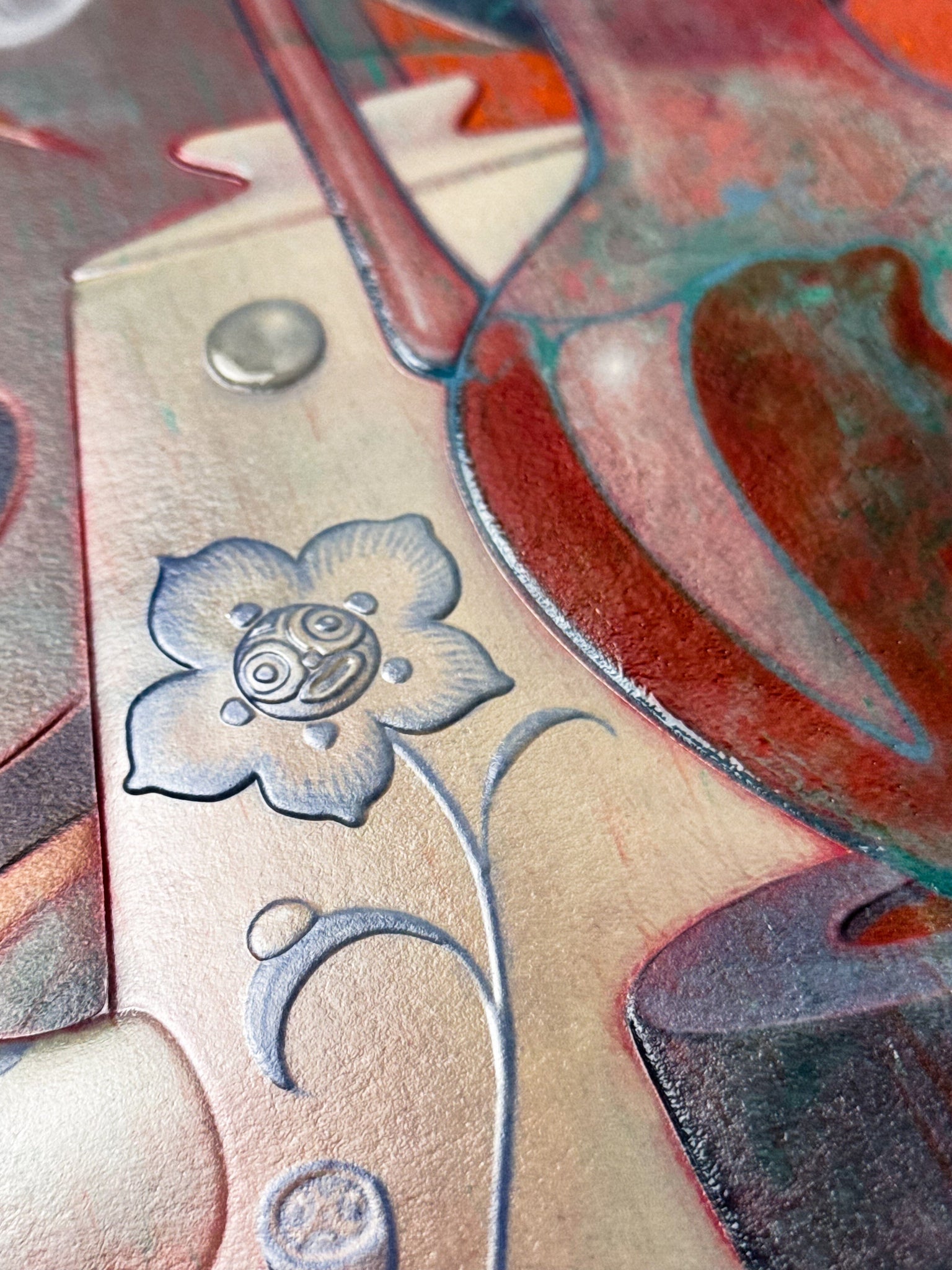 Medium: Archival 310 gsm 100% cotton-rag paper with archival pigment-based ink. Intricate foil detailing and sculptural glass-like details and enhancements.