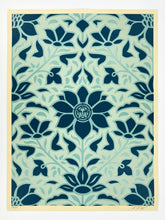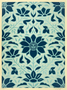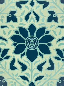 "I have enjoyed designing wallpaper patterns for about 20 years. They began as a way to add a pleasing decorative element to my fine art pieces as well as a device to use in my large scale modular street installations that would serve as a rhythmic break between grids of smaller posters and larger scale images. As I became better at designing patterns my goal became to make a pleasing stand-alone image for each tile of the wallpaper grid, but also to make sure the repeating pattern worked well. I’m a big fan of early Art Deco which retained some of the curves of the Art Nouveau style but evolved it to be more simple and structured… it’s from this era of Art Deco that this pattern takes its inspiration."