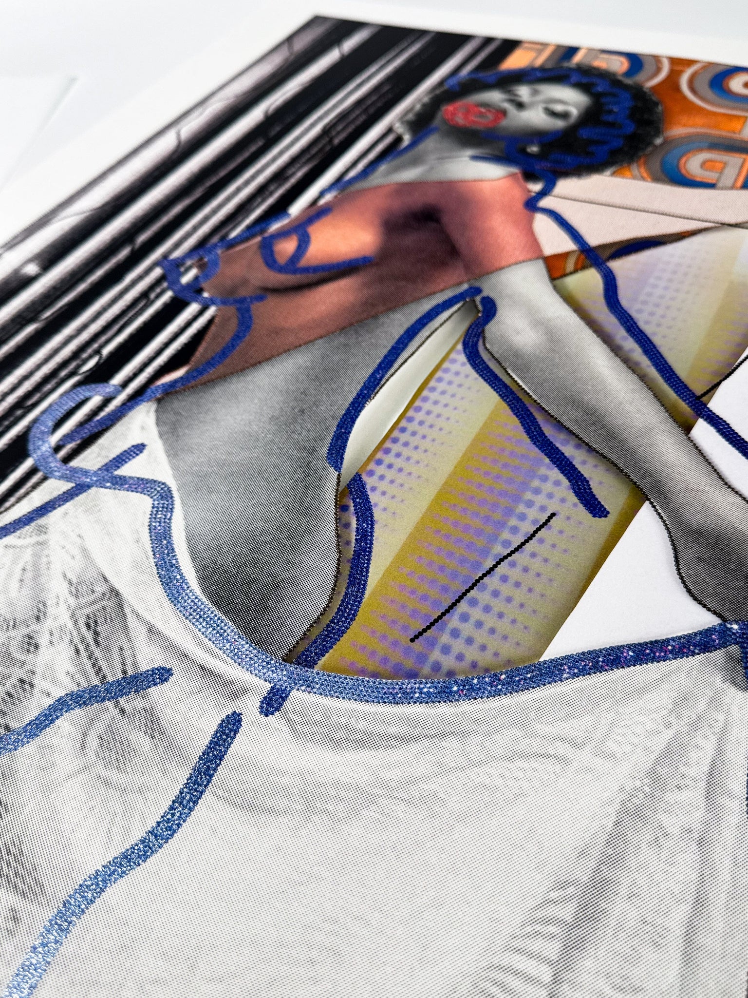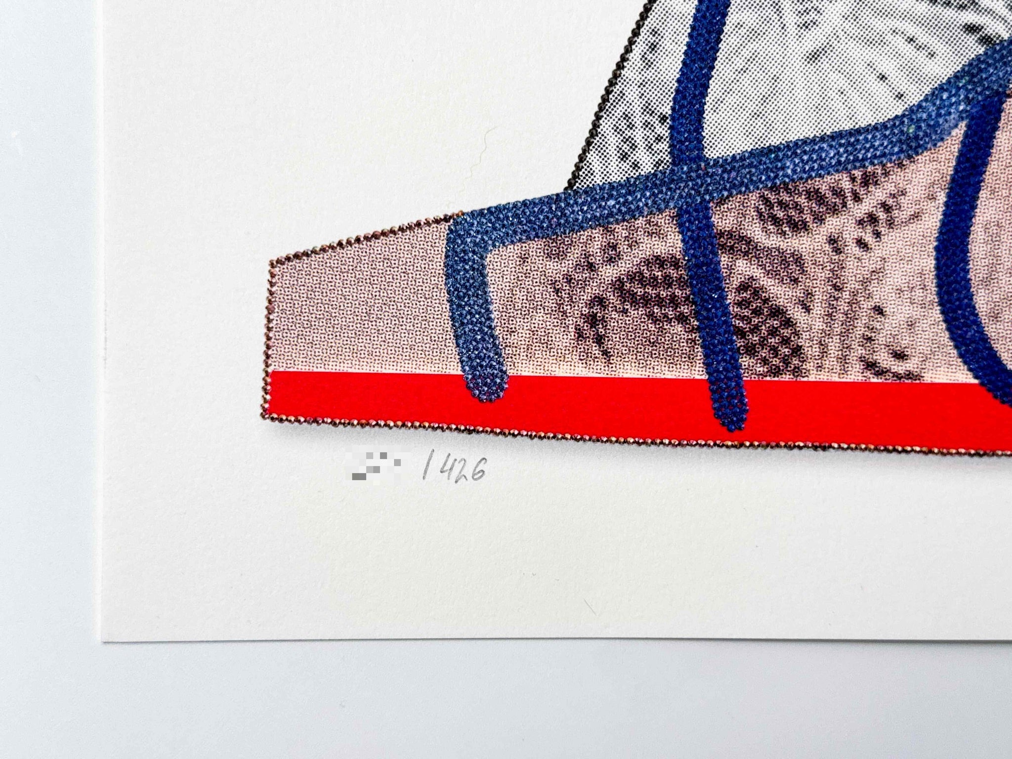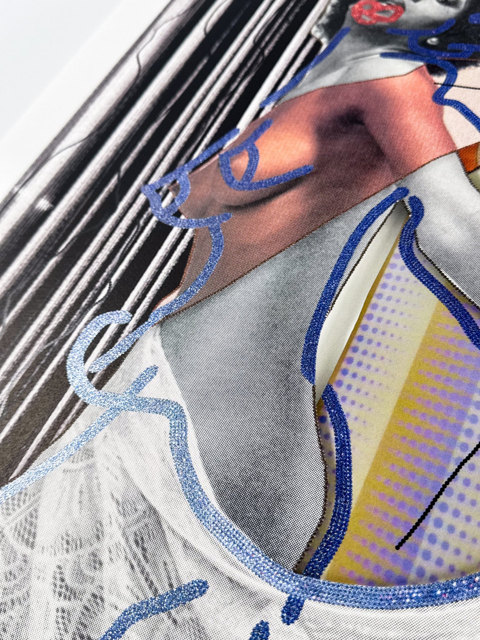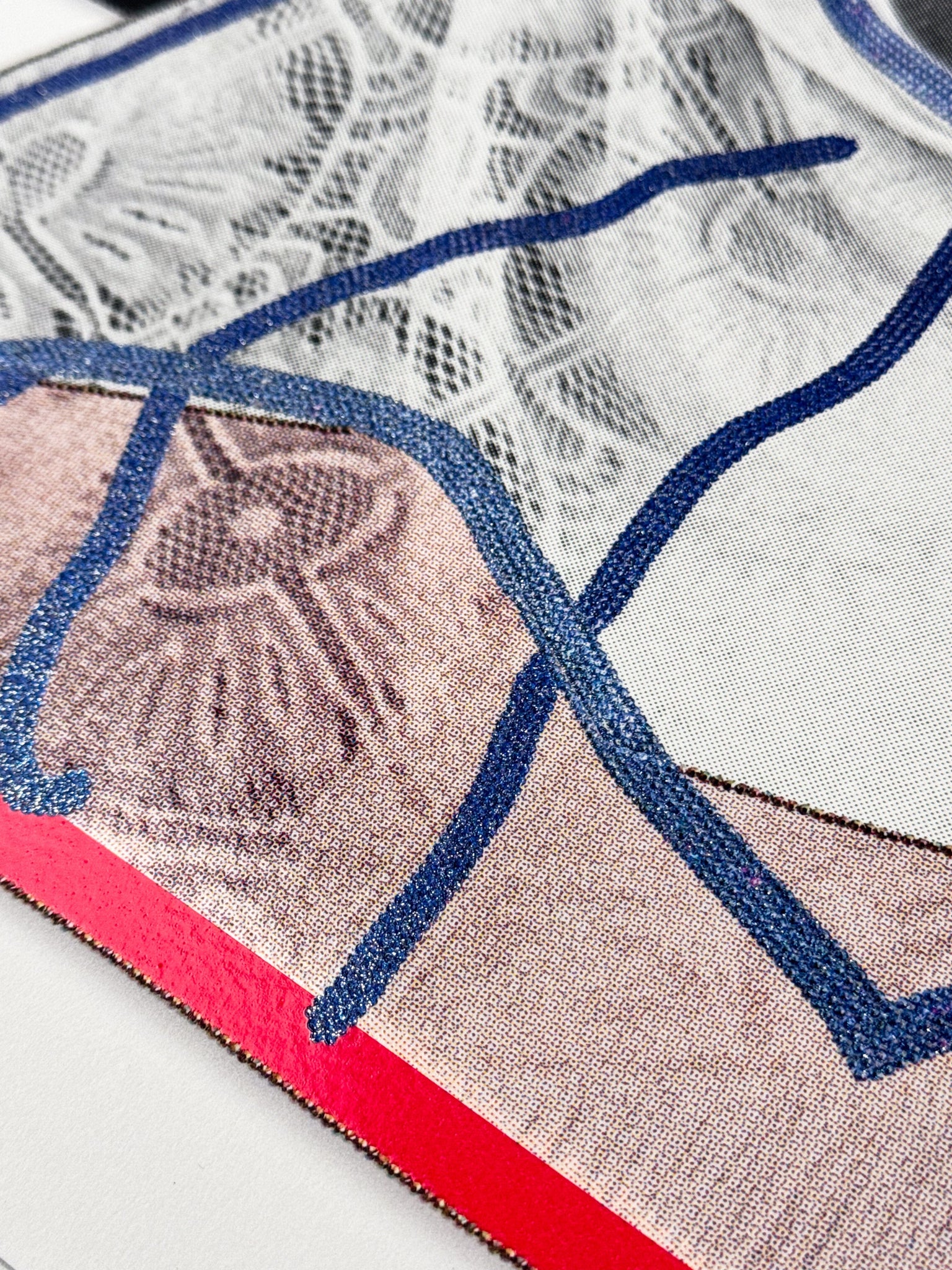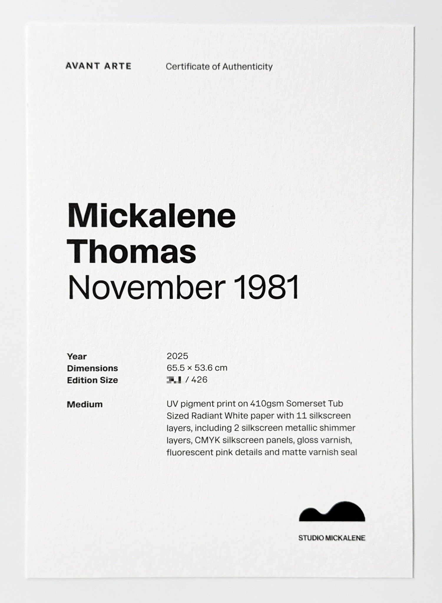 Medium: UV pigment print on 410gsm Somerset Tub Sized Radiant White paper with 11 silkscreen layers, including 2 silkscreen metallic shimmer layers, CMYK silkscreen panels, gloss varnish, fluorescent pink details and matte varnish seal.