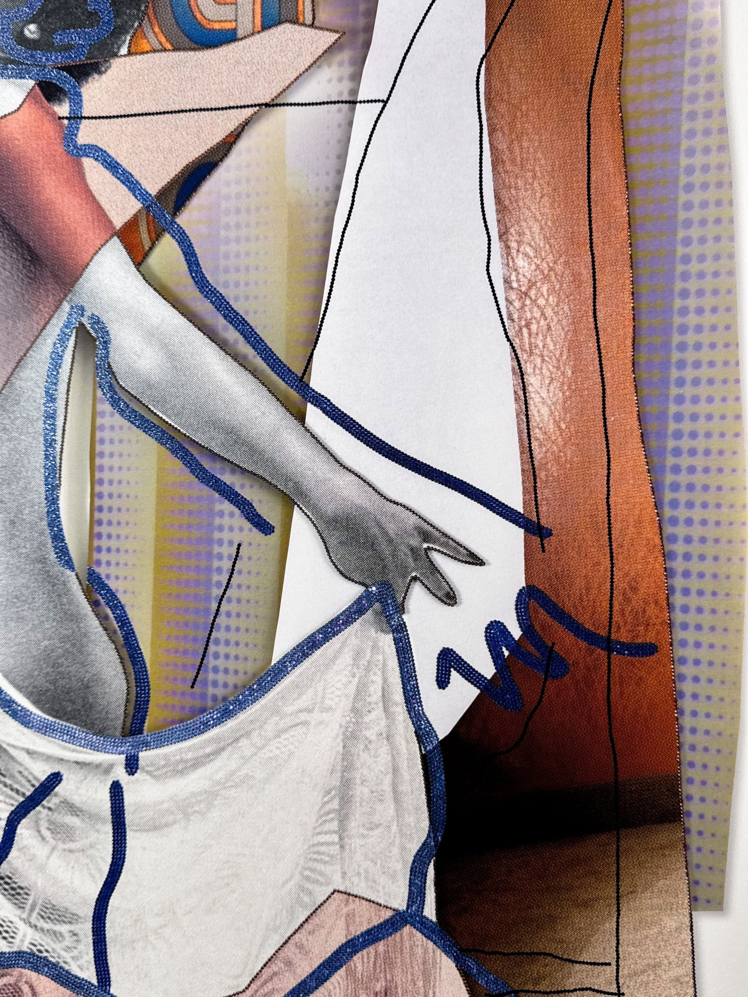 Mickalene Thomas (b. 1971) is a contemporary American visual artist known for her opulent, figurative artworks using materials like rhinestones, acrylics, and enamel. Her pieces merge influences from Impressionism, Cubism, and pop culture to explore themes of Black femininity, beauty, race, and sexuality. Thomas's work, found in major collections like MoMA and the Smithsonian, challenges traditional art historical narratives by placing Black women in self-affirming, sensual roles.