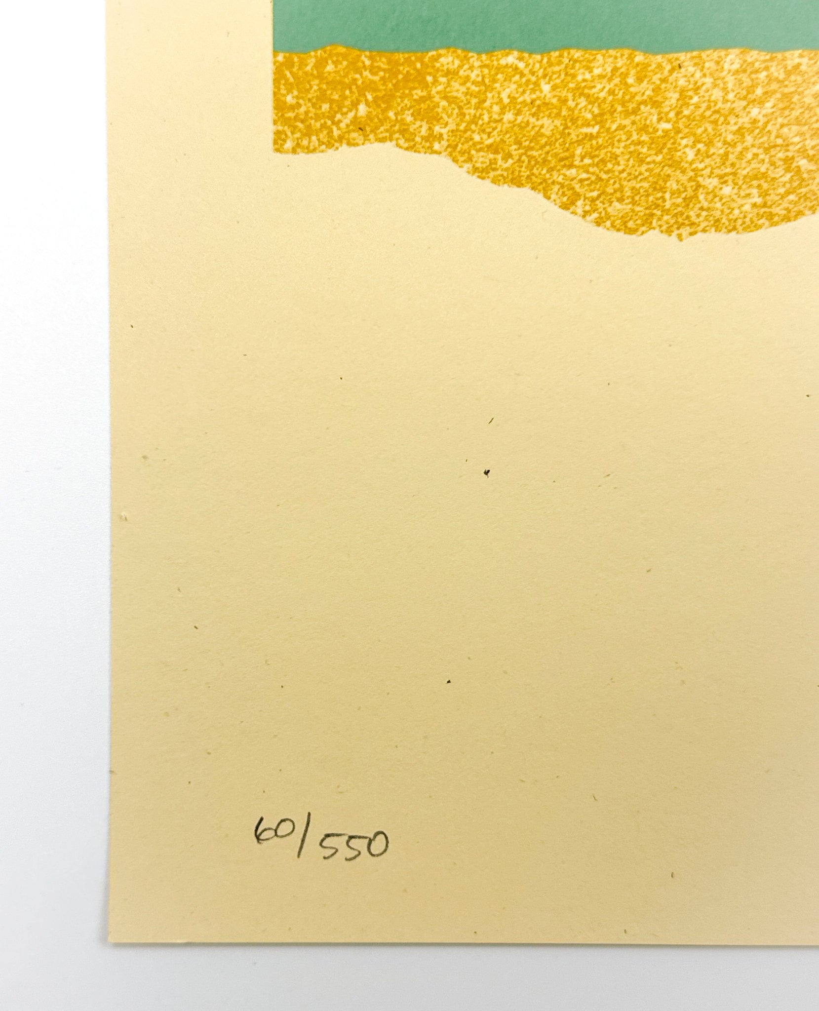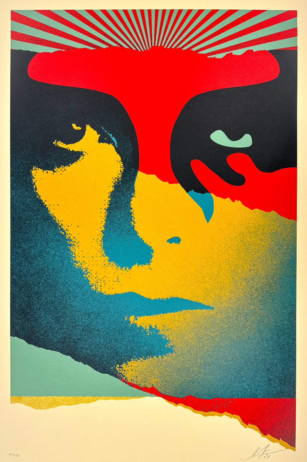 "This screen print, “A Cracked Icon,” is a reference to one of my favorite musicians, David Bowie, and his song “Cracked Actor.” I’m fascinated by how we process fragmentation and mutation, often trying to conceive a resolved whole from disparate parts. I was first intrigued by the unlikely juxtapositions of images yielded by ripped posters on the street revealing parts of unrelated images interacting with each other along organic ripped edges. Sometimes, the serendipitous placement of a rip can make two images feel like they are meant to be in conversation. I think that our brains are looking for harmony even within obvious transgression. We are all full of contradictory impulses, and our egos often drive which things we are justifying moment to moment. Bowie was constantly exploring the ideas of ego, fame, identity, and evolution, so I think this image serves as both a pleasing visual and a provocation to consider the tension between harmony and conflict, competition and collaboration. Bowie embraced collaboration adventurously to great success, so hopefully, he’d dig this image and tribute!"