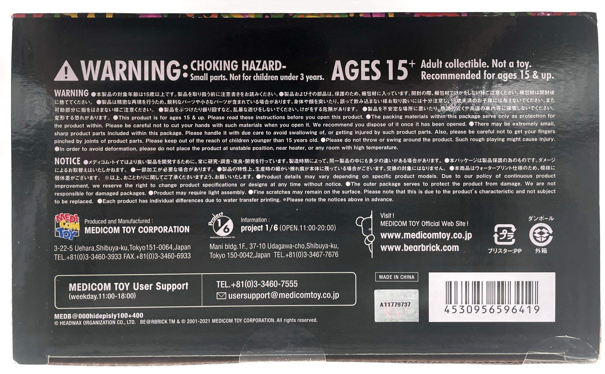 Medium: From Medicom Toy. This design is in a 100% scale (2 3/4" tall) and 400% scale (8" tall) two-pack. Original box included. Each figure was painted using a unique hydro dipping technique that causes each figure to be slightly different.