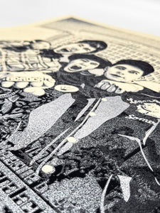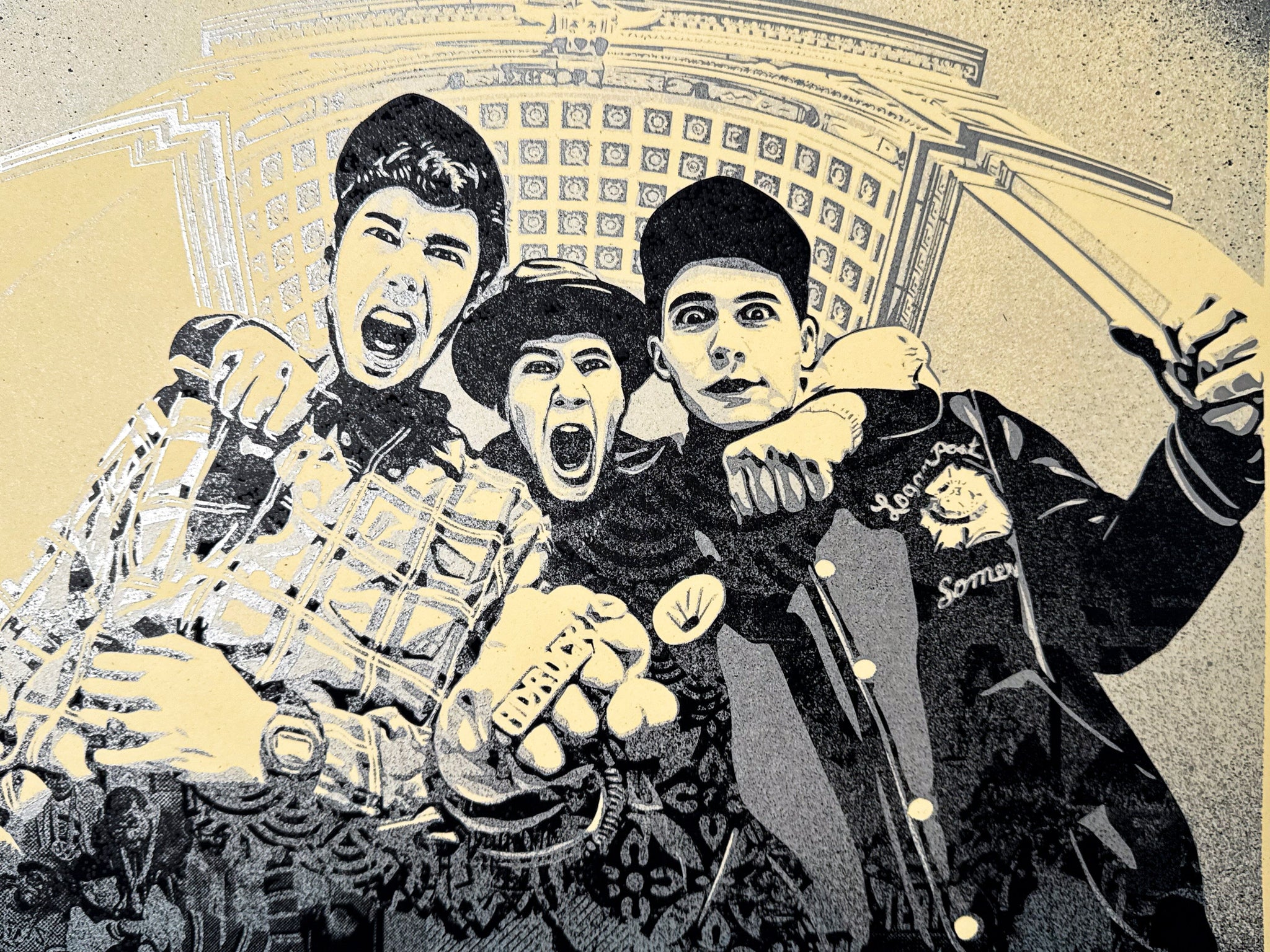 "I first heard about the Beastie Boys in 1985/86 because they were on a hardcore compilation album called “New York Thrash,” which also featured Bad Brains, whose name I later discovered had inspired the Beastie Boys’ choice of a name using BB initials. When the Beastie Boys’ album “Licensed to Ill” came out, I was intrigued and exhilarated by their metamorphosis into a hip-hop group because I had mainly been listening to punk. Even though I liked RUN-DMC and the hip-hop from Beat Street and Breakin’, I felt awkward being into hip-hop as a white kid. “Licensed to Ill” was instantly infectious and a thrilling sonic encapsulation of bratty teen rebellion. It was (and is) a great hip-hop album, but it threw in punk and metal references and samples along with the hip-hop ingredients and amazing rhymes. The Beasties blew the doors open for me to embrace other hip-hop like LL Cool J, Public Enemy, Boogie Down Productions, N.W.A., and Slick Rick. “Licensed to Ill” was a life-changing album for me, but also the album that supercharged the crossover of hip-hop to the mainstream begun by RUN-DMC. The only prominent portrait poster of the Beastie Boys that I saw in the record stores of Charleston, SC at the time was a photo taken by Glen E. Friedman of the Adidas-clad Ad-Rock and Mike D sitting on a skateboard with MCA jumping off the Washington Square Park arch in the background. That image is beautifully composed and transports me to my teenage self, who lived for music, skateboarding, and jumping off of stuff. I’m honored to collaborate with Glen on a print based on another photo from that same Washington Square Park session. I think the image conveys the energy and camaraderie of the Beasties as their musical careers were about to explode and transform culture over the course of several masterpiece albums."