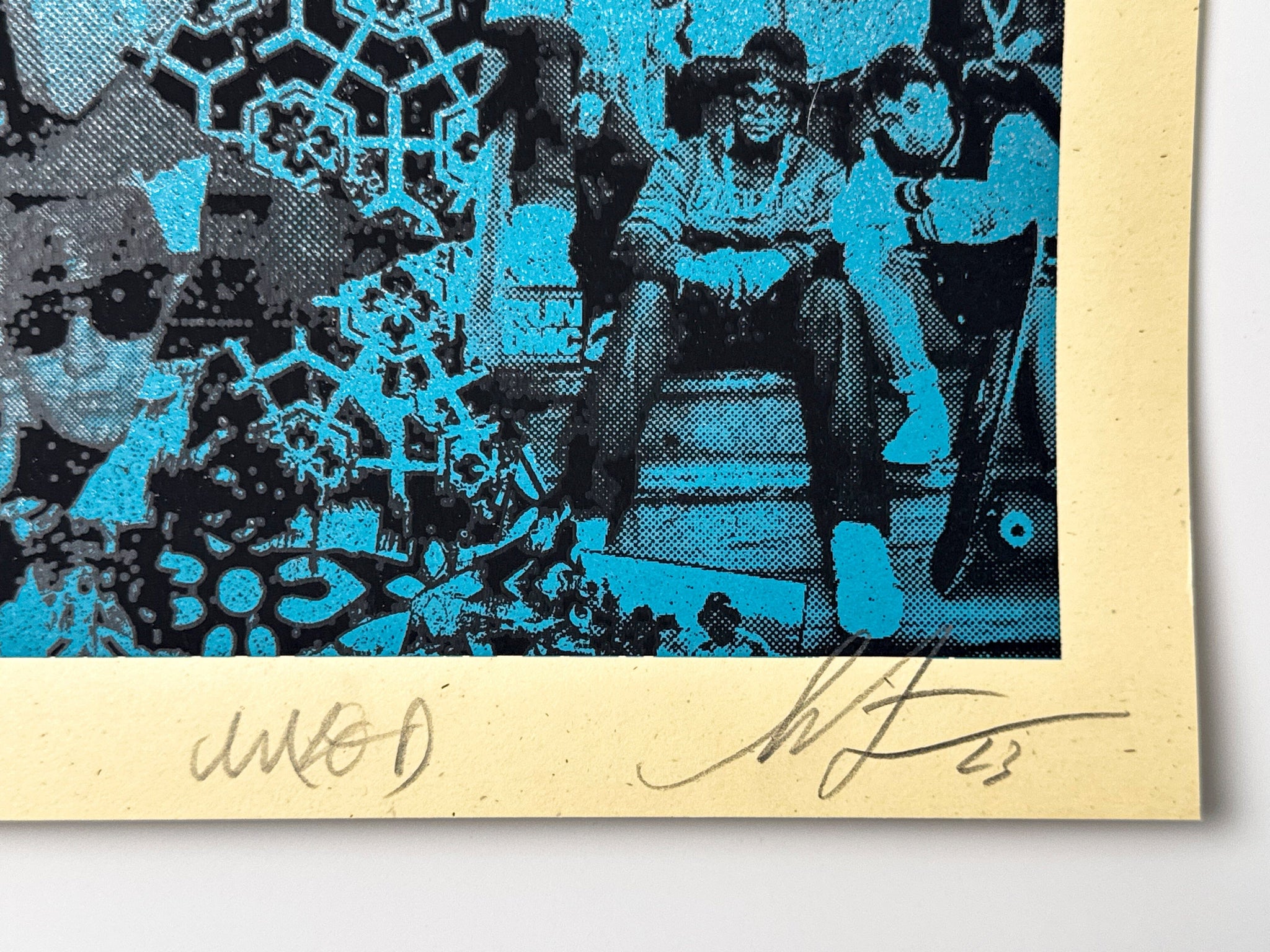 Medium: Screen print on thick cream Speckletone paper. Blue variant with reflective silver silkscreen ink.