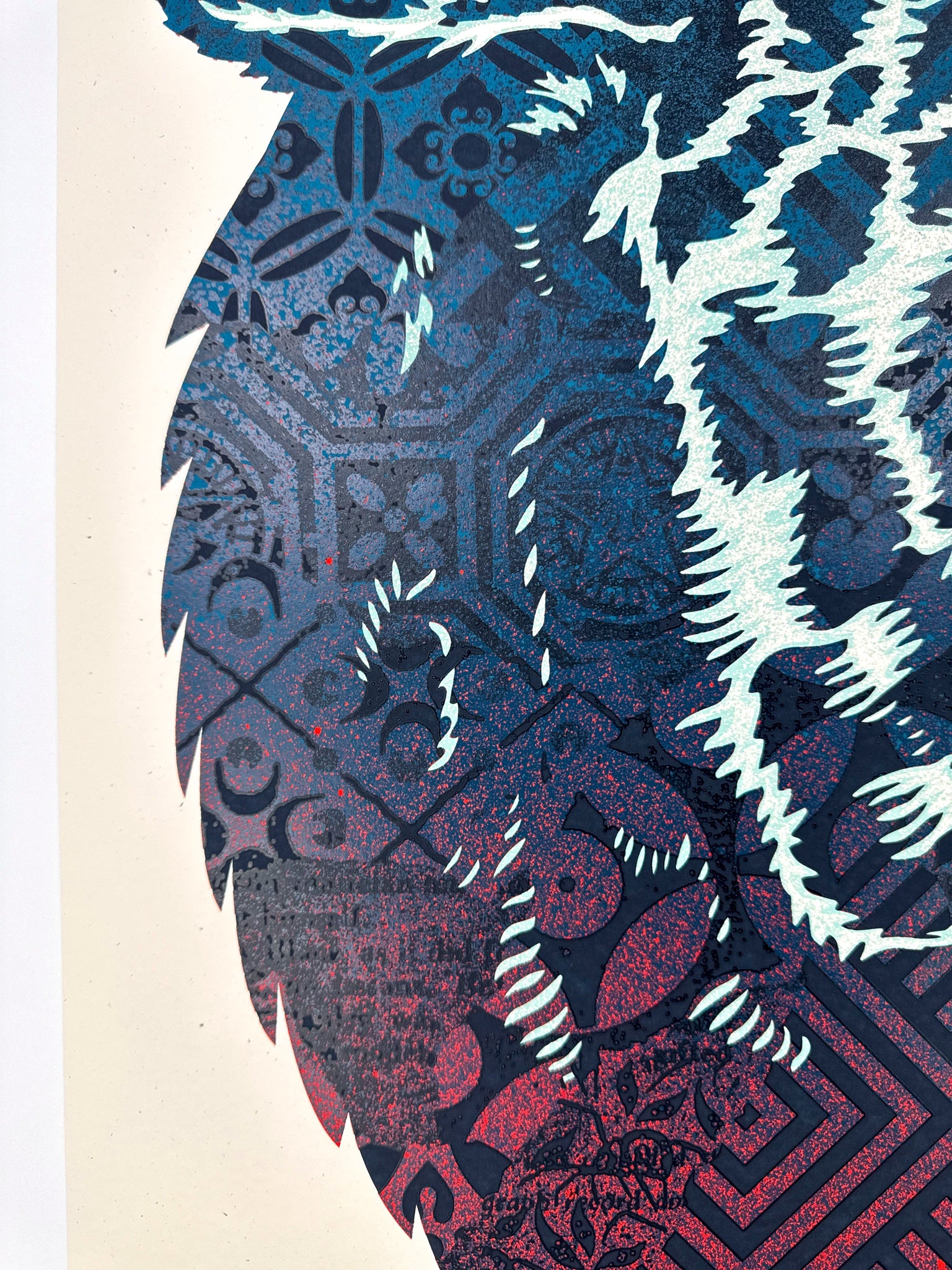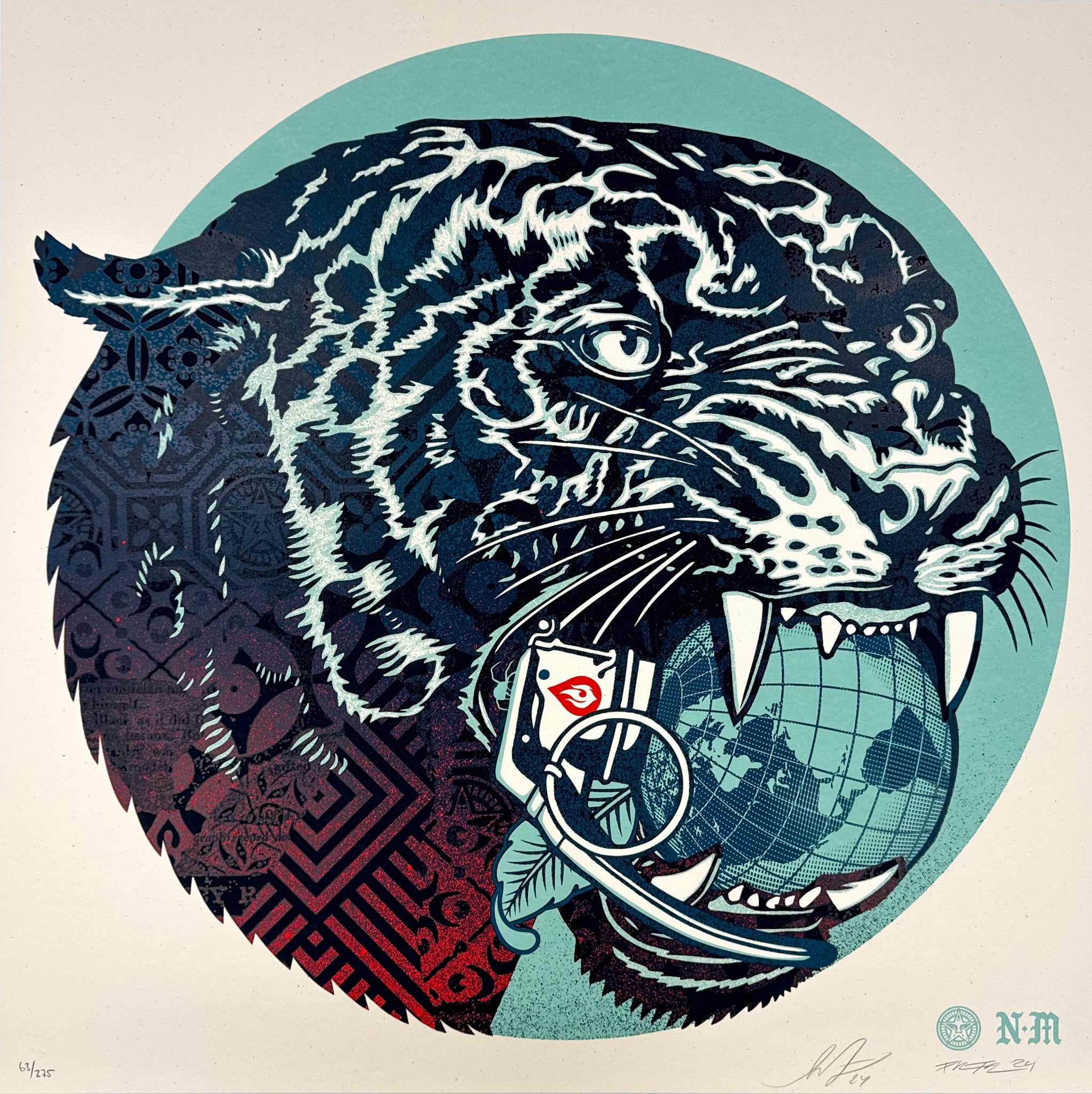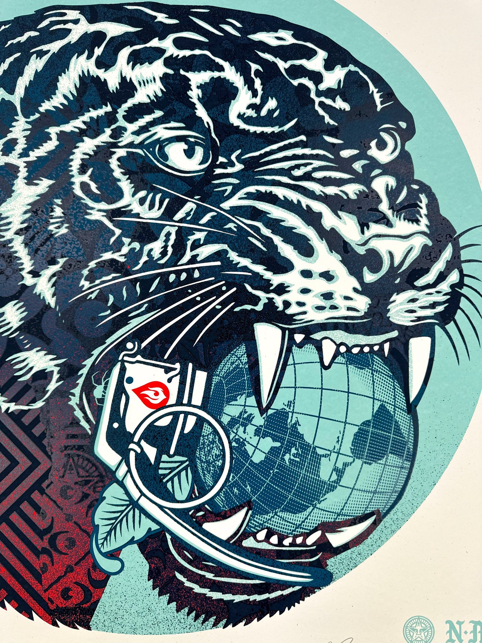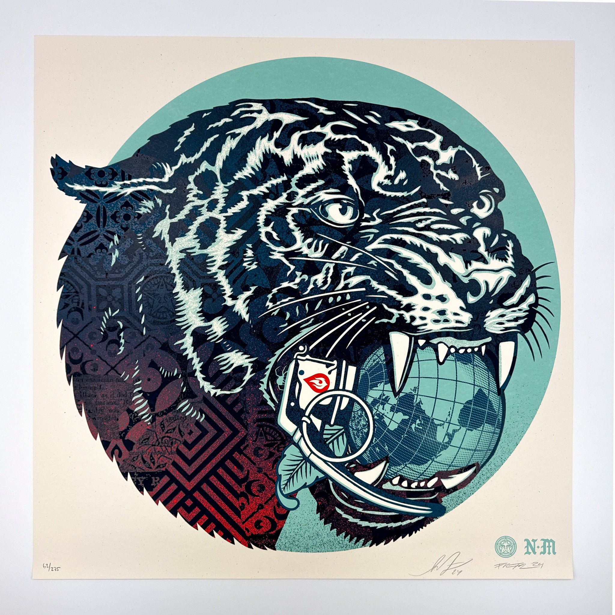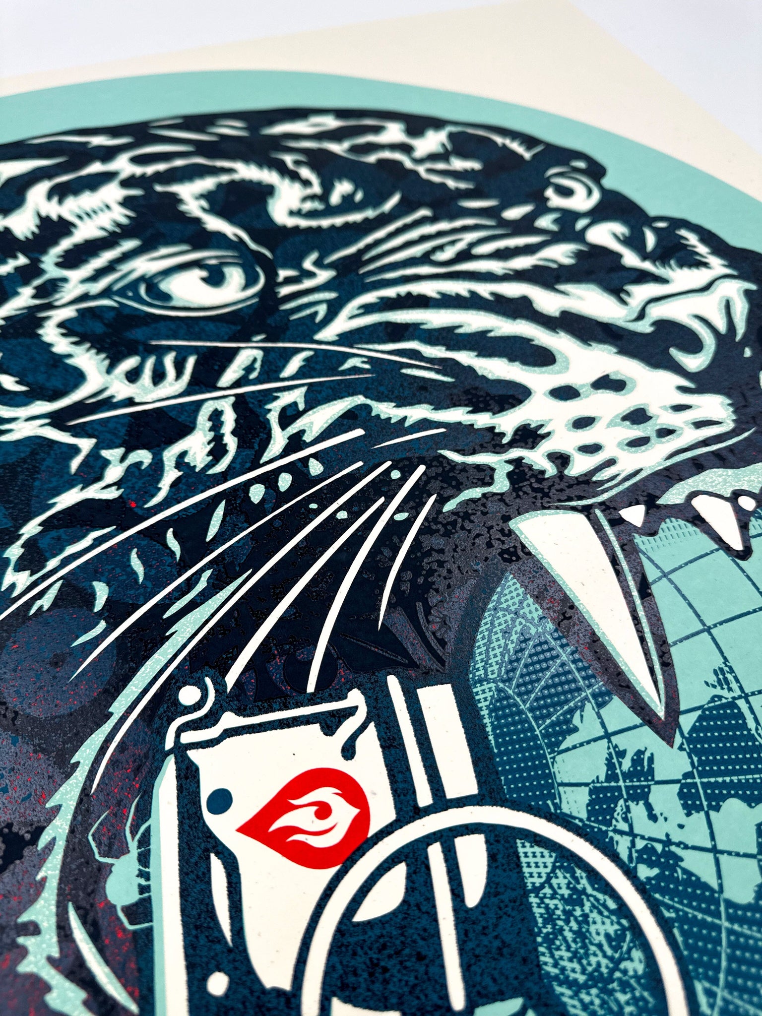 "The only thing I’d add to what Cisco said is that big cats, like the one seen in this print and as team sports mascots, are beautiful, powerful, and dominant except when threatened by humans and human made climate change. It would be a tragic irony to lose these creatures living in the physical world leaving them remaining only as heroic images and logos. We are on the brink of this irony becoming a reality for many species.