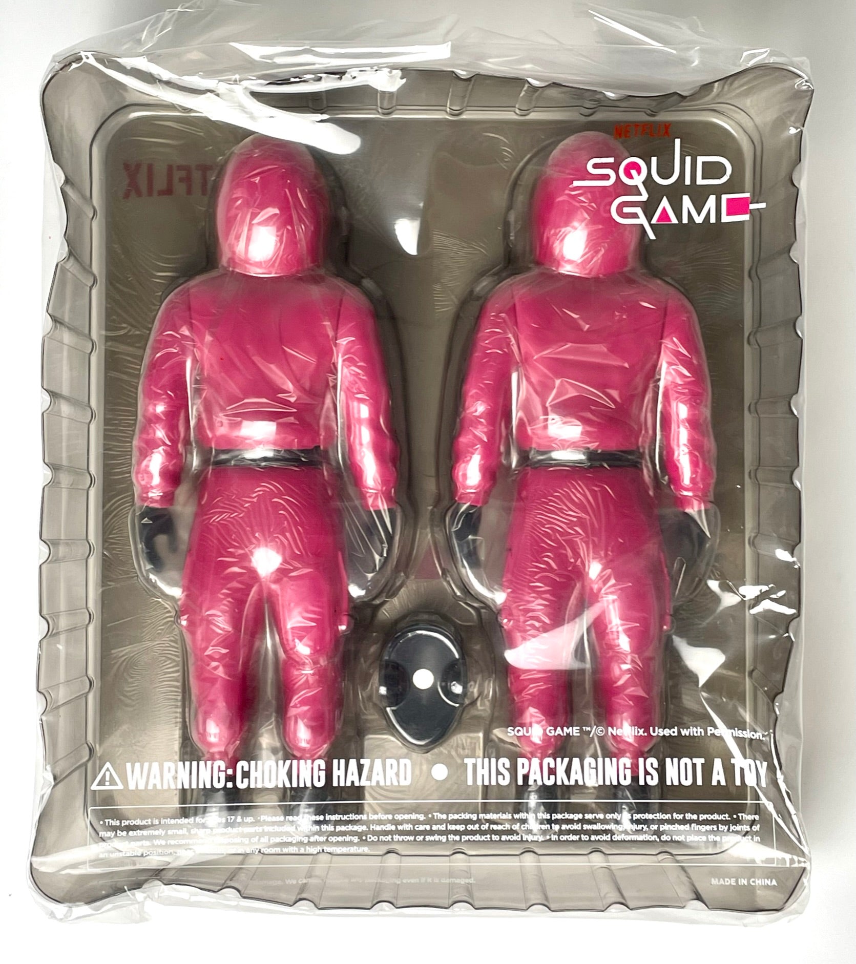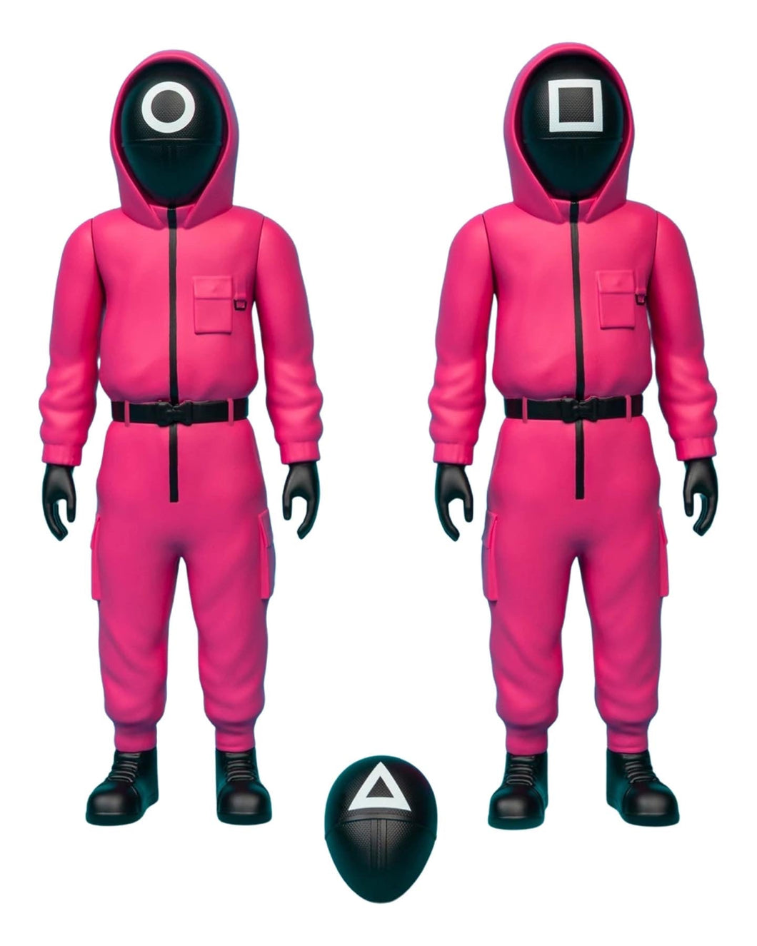 Officially-licensed limited edition (500) vinyl figures from the hit Netflix Korean drama Squid Game. An AllRightsReserved collectible, the set features two guard vinyl toys (9″) in the now iconic pink suits with three removable masks to share between them (circle, square and triangle – of course).