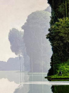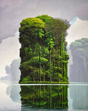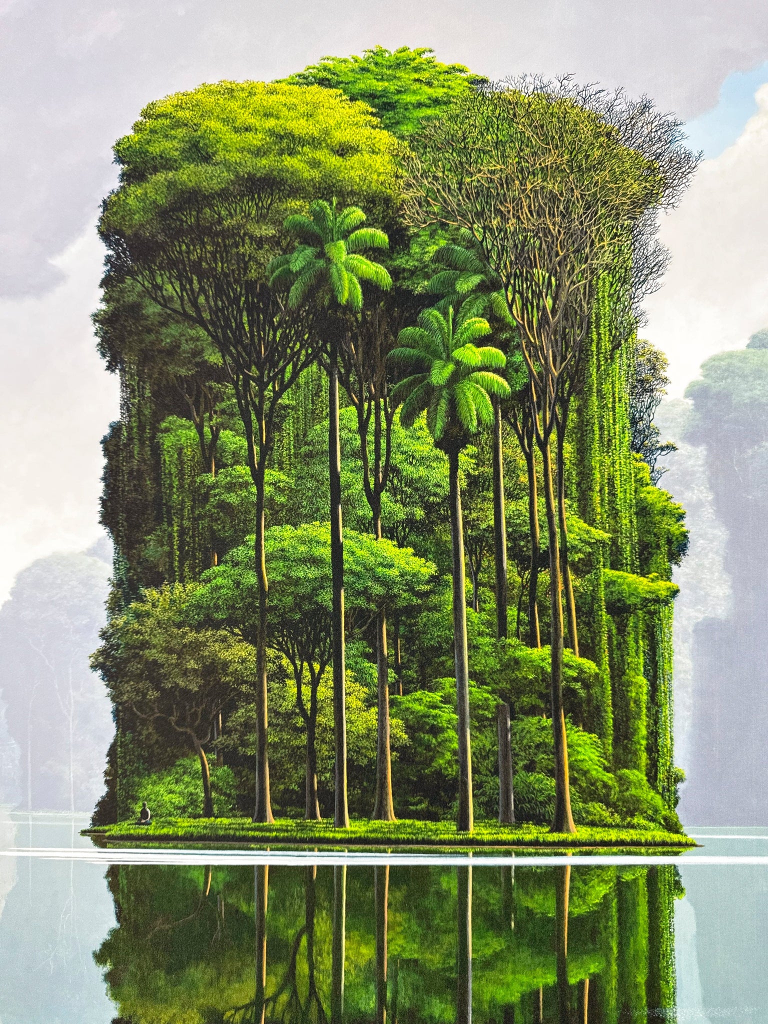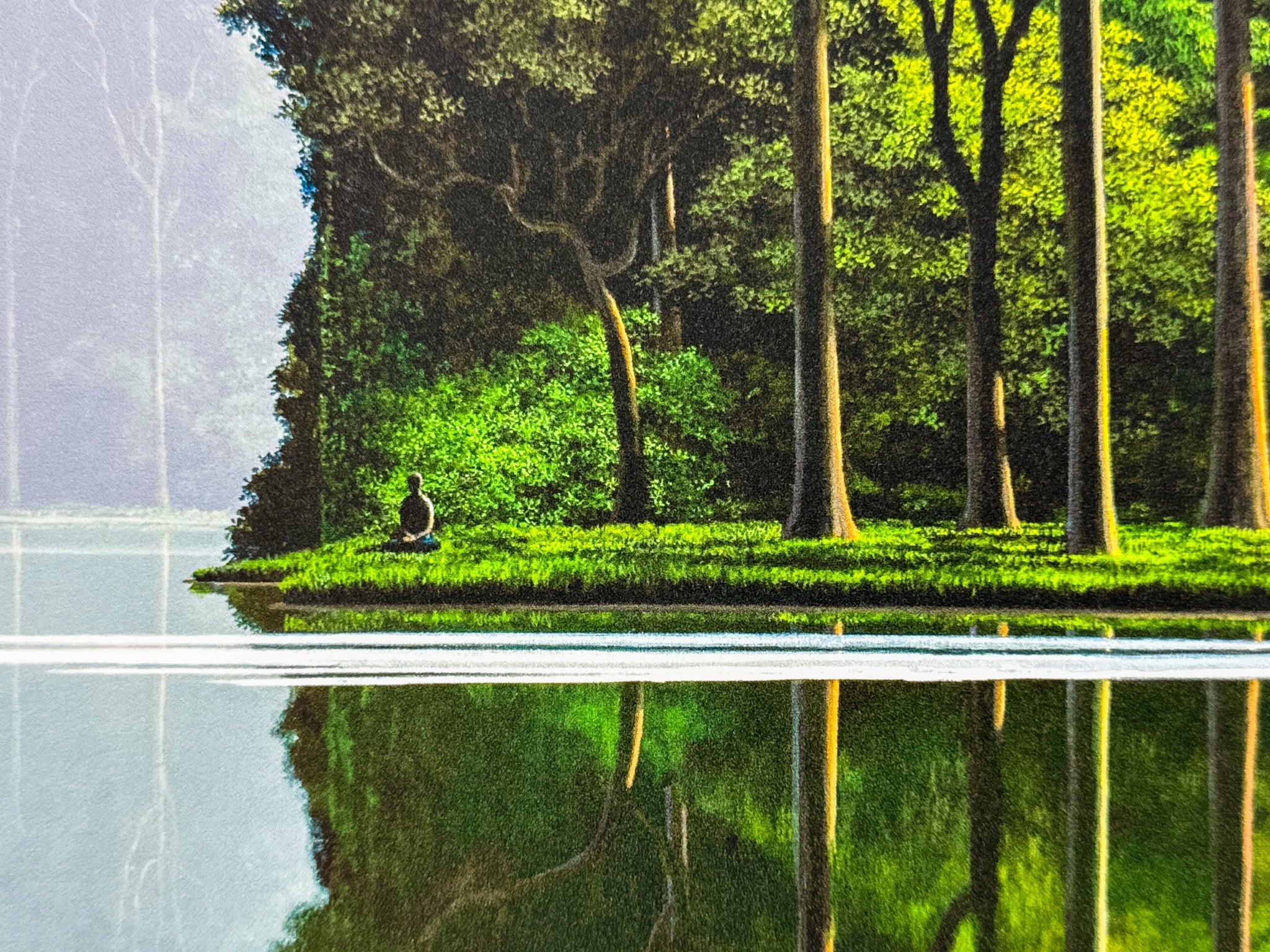 Inner Love places its cross-legged subject on a mirage-like island, mirrored perfectly in the water that surrounds it. As with many of the artist's landscapes, the scene is inspired by verdant forests and tranquil rivers close to his studio in Costa Rica. For Sánchez, the artwork provides space for a moment of self-reflection.