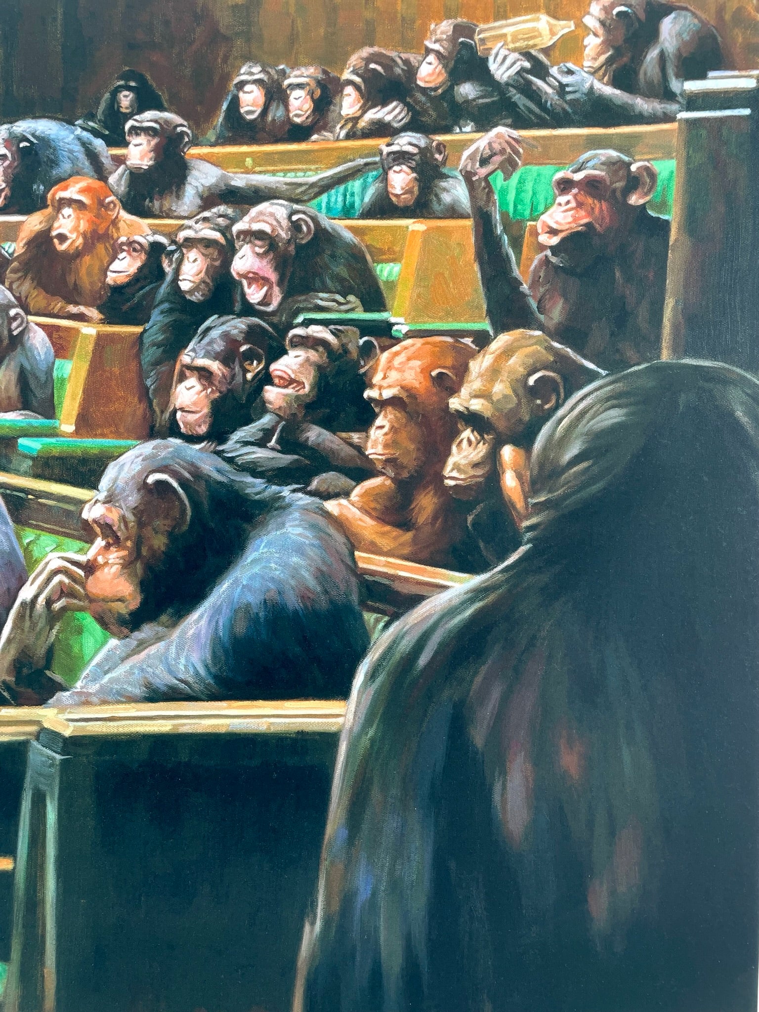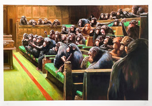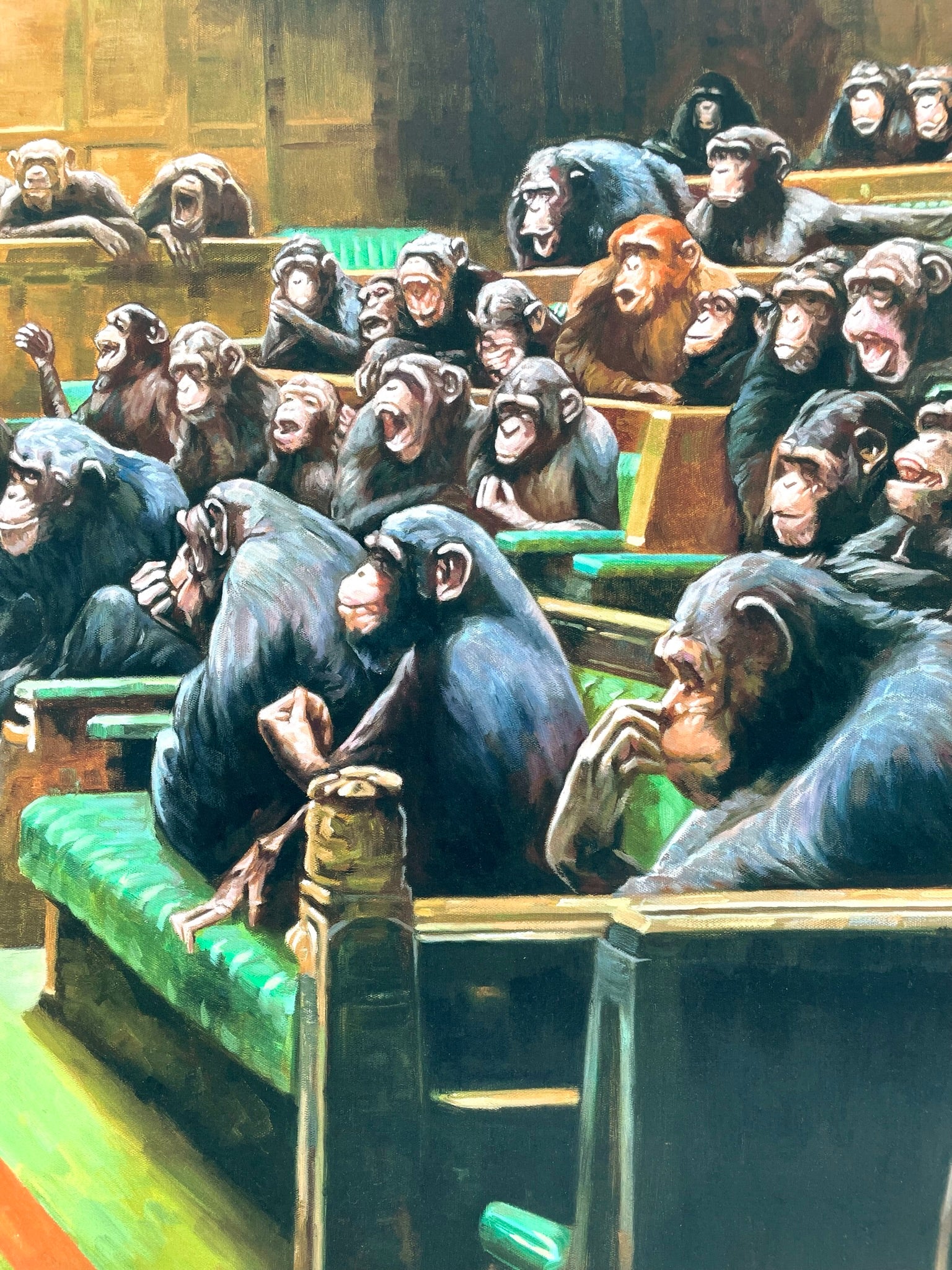Rumored to be the actual artist who painted the famous 'Monkey Parliament' painting under Banksy's direction which sold for a record breaking $12 million at auction, Mason Storm has released this exceptional limited edition print which is considered to be based on the original reference used to paint Banksy's famous 'Monkey Parliament'. This is the release of the right side of the entire painting.
