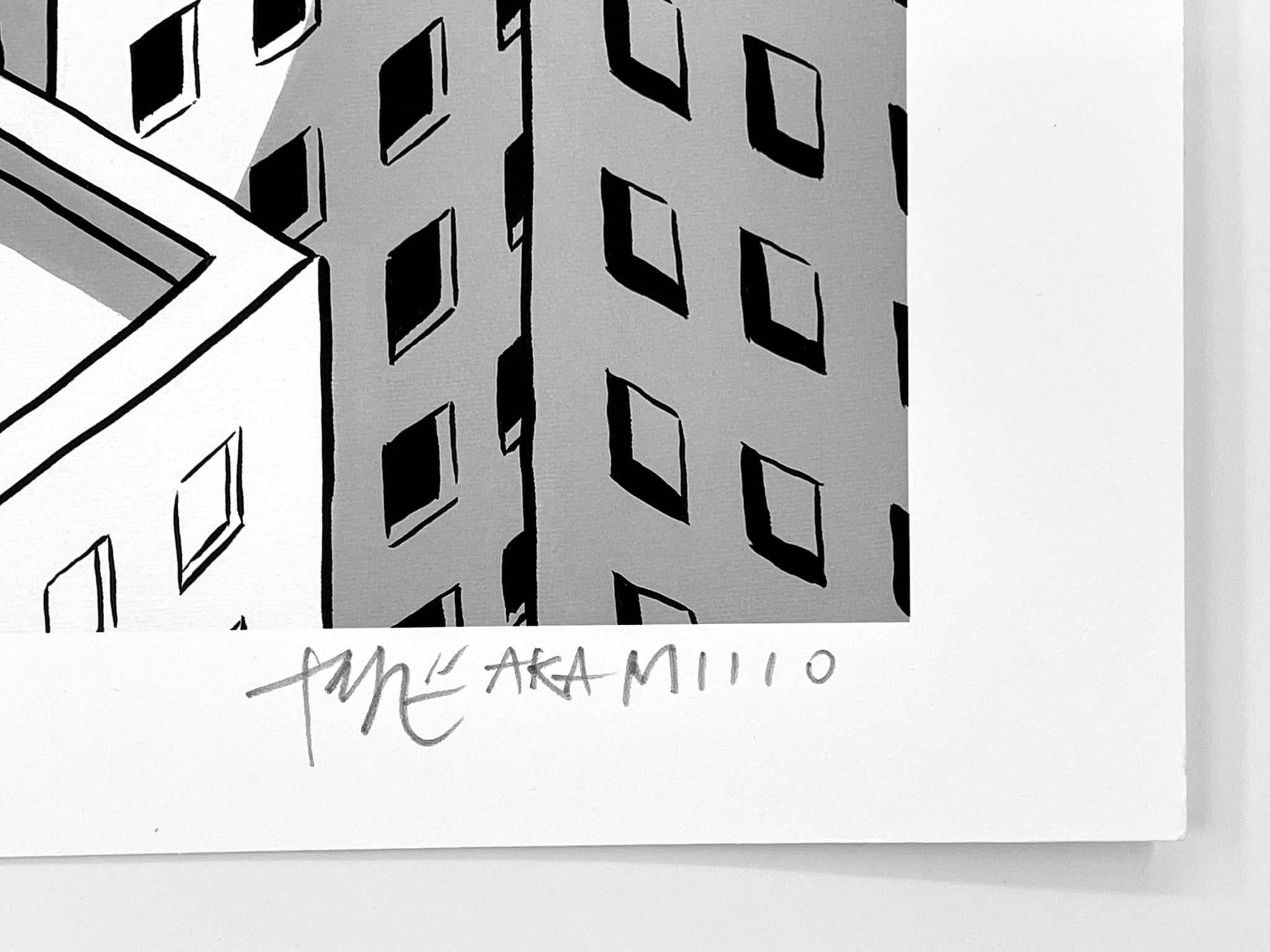 Now, he squeezes epic landscapes onto the sides of residential and commercial sites, populating his creative worlds with gigantic, child-like figures who play with makeshift telephones and building blocks and paper cranes and trains. Sometimes coyly surreal, other times borderline terrifying, his designs appear like Brazilian brothers Os Gemeos' street art mixed with the black-and-white world of graphic novelist Yumi Sakugawa. Needless to say, we like it.