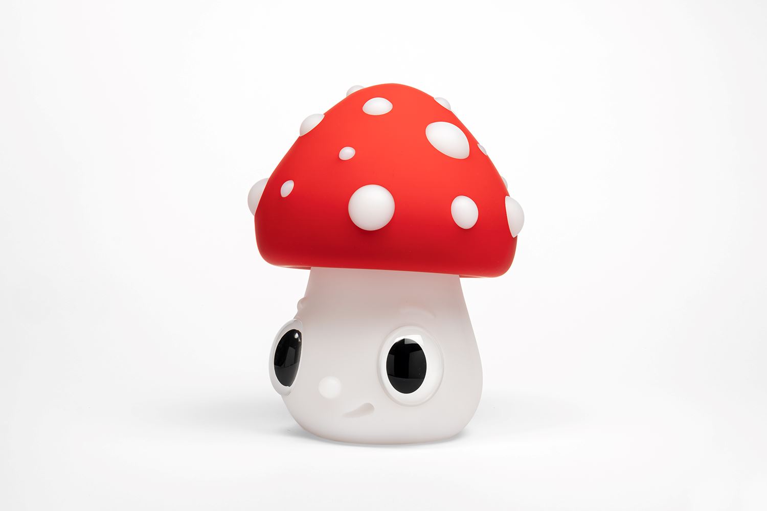 Javier Calleja and CASE STUDYO are proud to introduce the next fruit of their teamwork – Nightlight Mushroom Lamp. After a series of planter pots, this functional, somewhat interactive sculptural piece is a continuation of the artist’s vision to find different ways of incorporating elements from his distinctive universe into everyday life. Loosely based on a character that was originally introduced in work on paper in 2021 (Time After, 2021) and was further elaborated in painting format at the summer 2023 London solo show with Almine Rech (Lean on Me, 2023), Nightlight Mushroom Lamp is a new character with an emblematic Amanita muscaria mushroom top as hair. Keeping in mind the glow effect of the object, the face/stalk of the fungus is kept pale white, to some extent nodding to the idea of the psychedelic qualities of mushrooms. Contrasting its simple yet unmistakable red-and-white color scheme, the facial features are given a cheeky expression with eyebrows raised and a crooked smirk. More noticeable when the light is on, the confused, surprised, perhaps distrusting appearance adds an almost interactive element to the stand-alone, USB-charged art device.