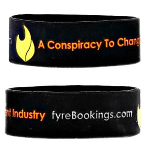 Each wristband displays the yellow Fyre Festival logo, it's website "fyrebookings.com" and in orange lettering reads "Conspiracy to change the entertainment industry" - how ironic!