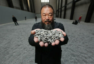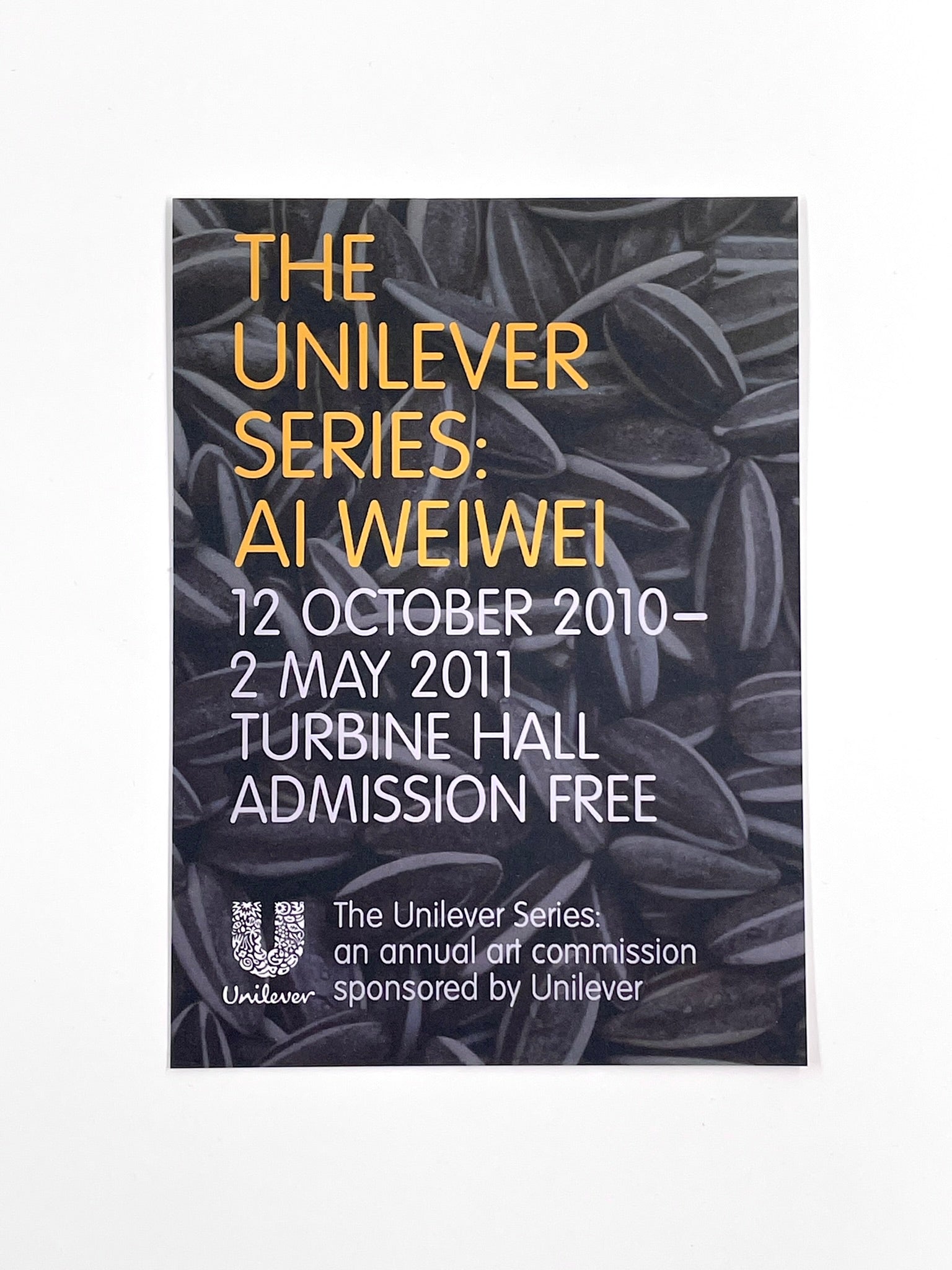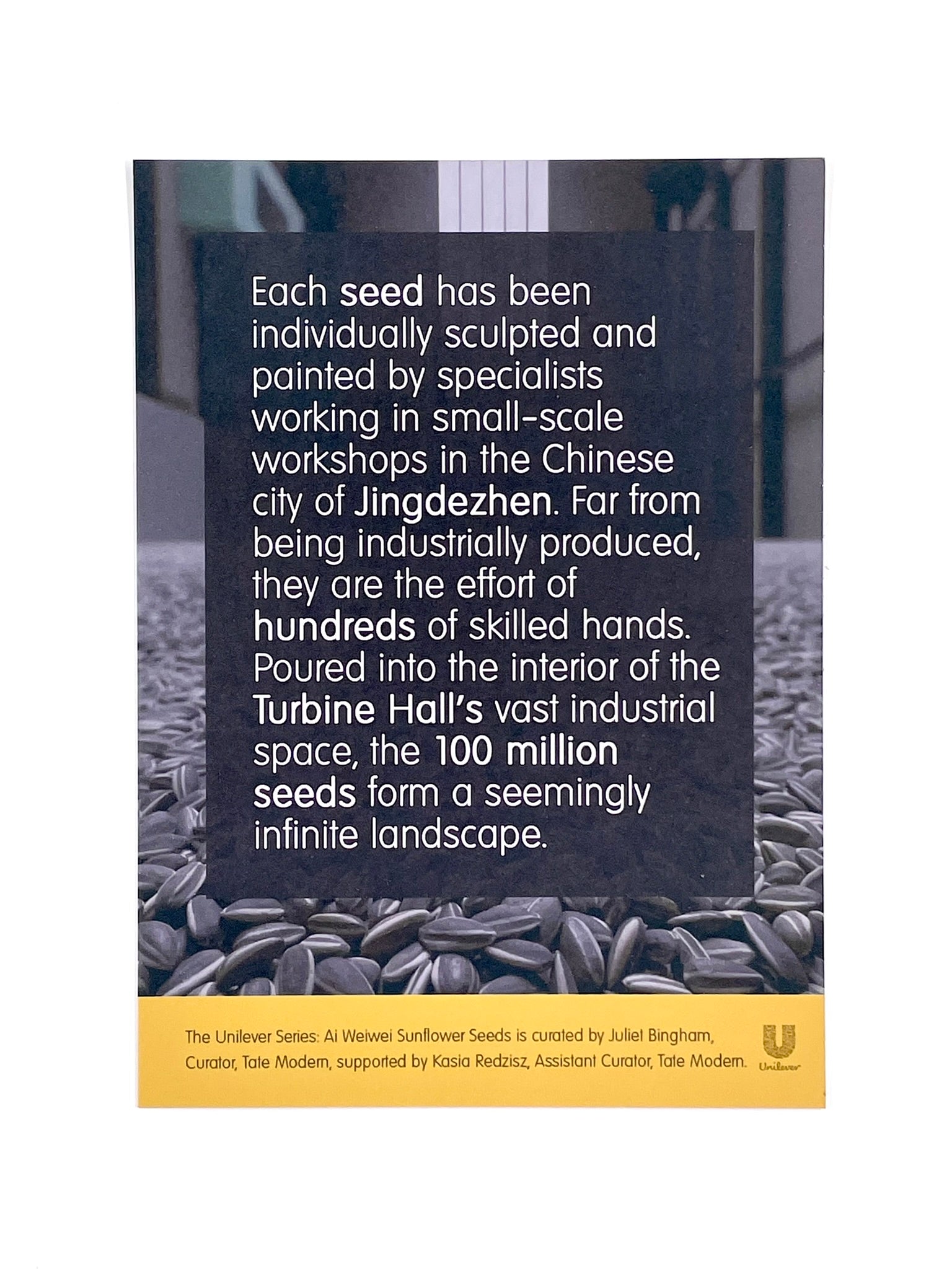 Ai Weiwei initially conceived 'Sunflower Seeds' for his Unilever Series commission at Tate Modern's Turbine Hall, opening in October 2010. Ai Weiwei's take on the large hall was simple and complex, poetic and disturbing at the same time: He filled the Turbine Hall with a thick layer of sunflower seeds handcrafted in porcelain, a total of 100.000.000 seeds, with a total weight of 150 tons.