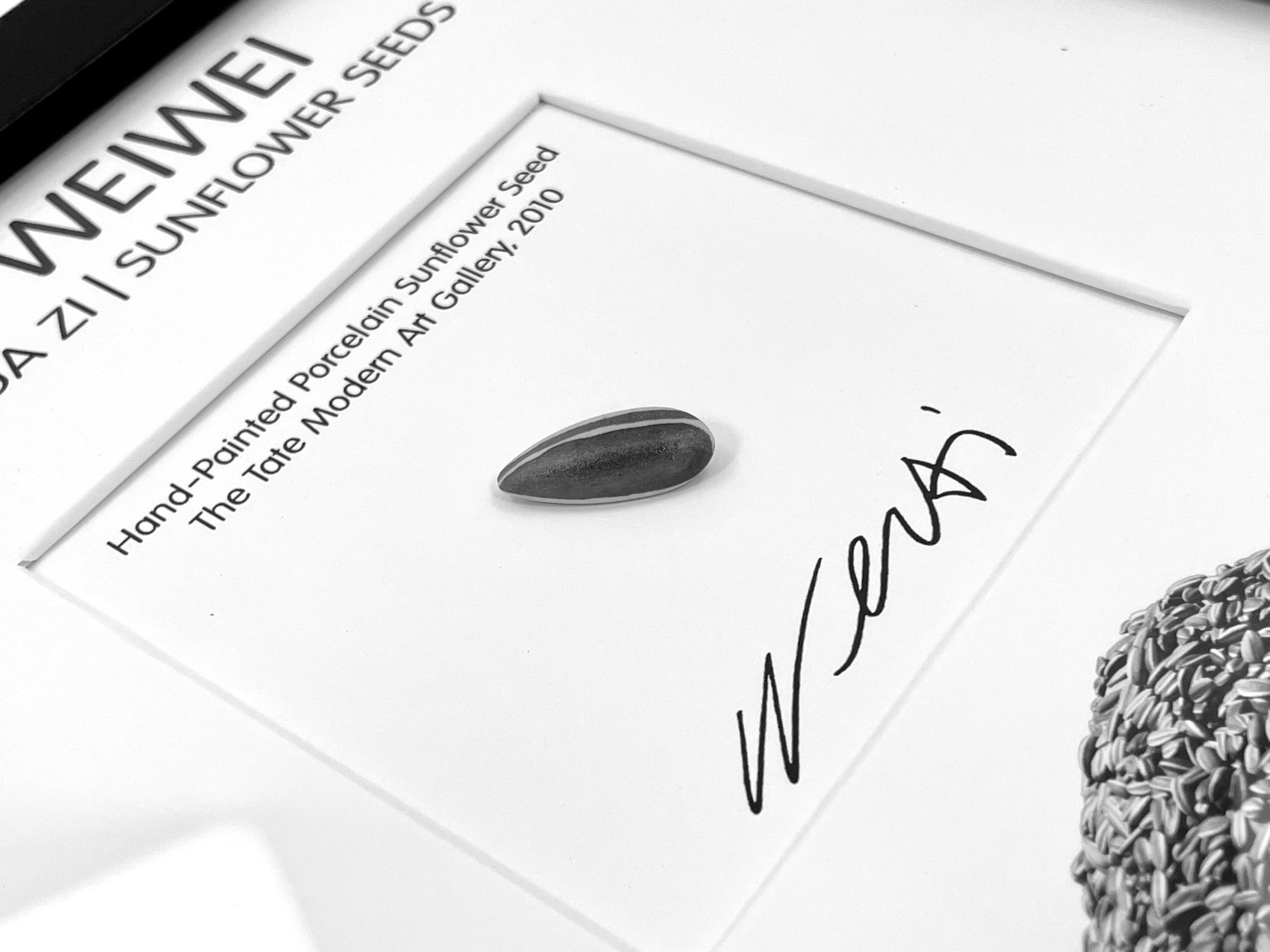 Medium: Hand-painted porcelain sunflower seed from the artist's infamous exhibit. Comes mounted on hardwood frame with plated signature. Includes show flyer.