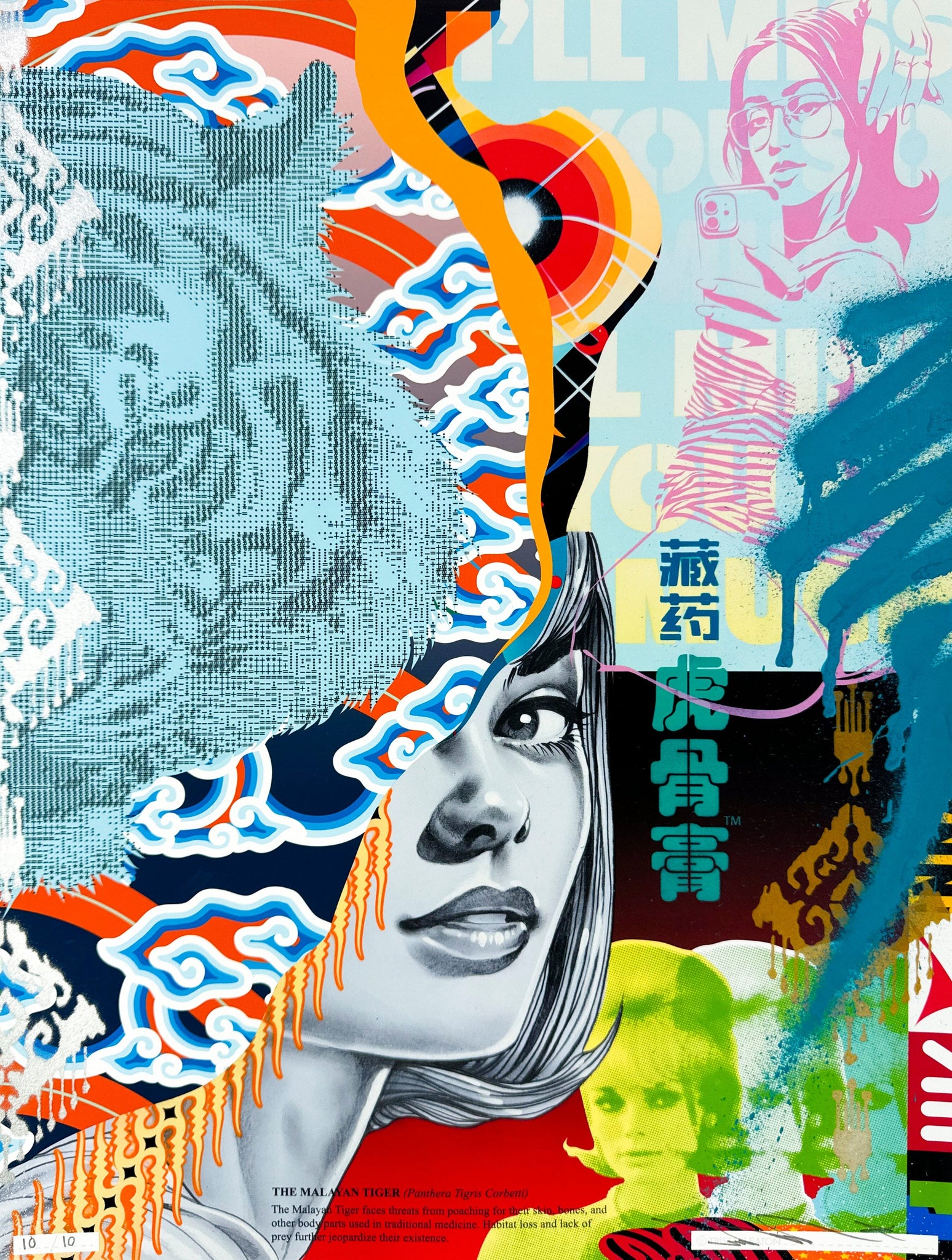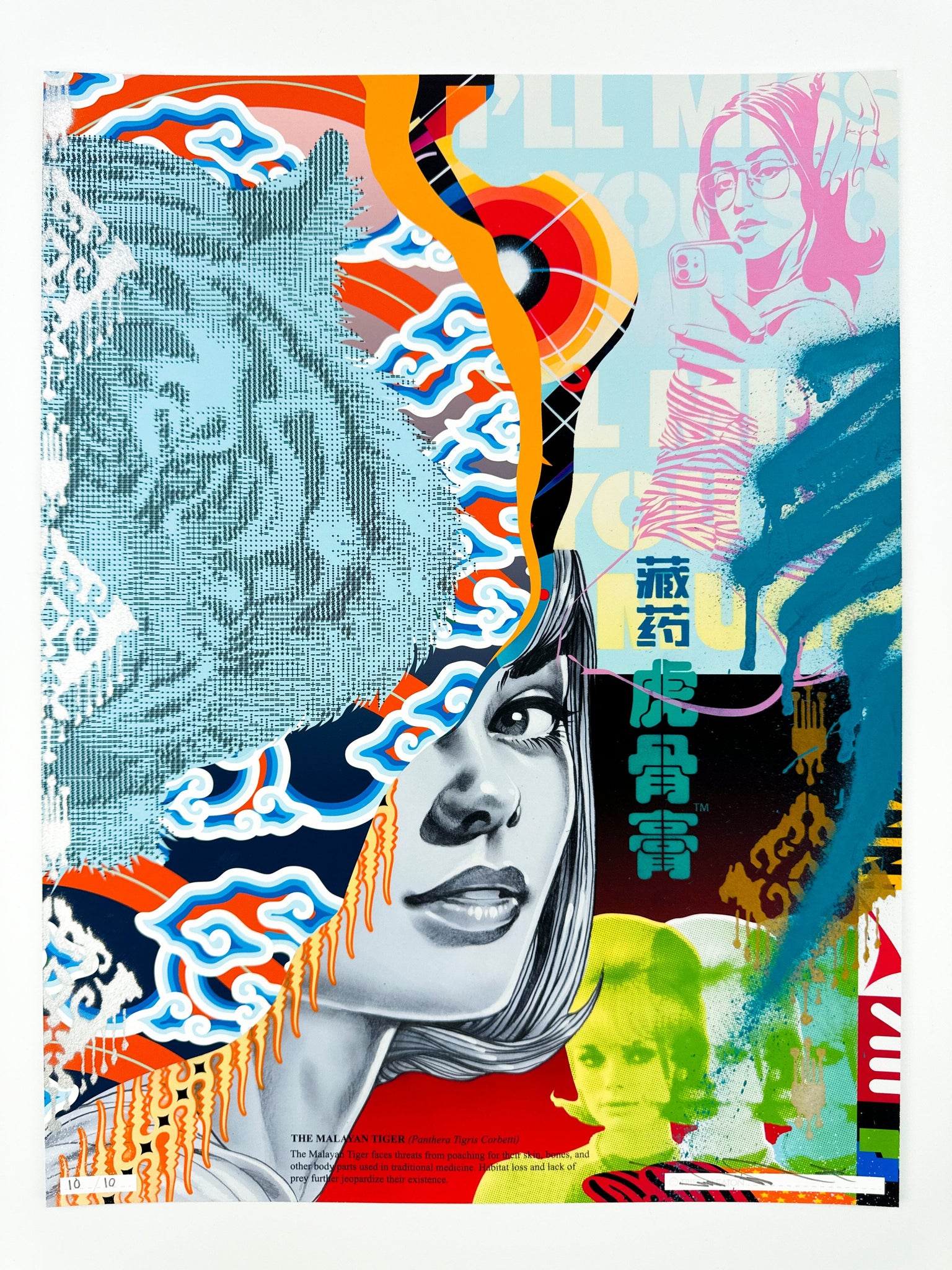 "This new Fine Art print collection shines light on some of the most endangered species on our planet. The Asian Tiger, The Javan Rhino, The Amur Leopard, The Saola and the Vaquita all become glorified in Eaton’s signature style of dynamic collage and story telling. The colorful compositions contrast the plight of these beautiful creatures with the apathetic detachment of the average human. In these images, sex, social media and consumerism take center stage, eclipsing the urgent need to help these special animals."