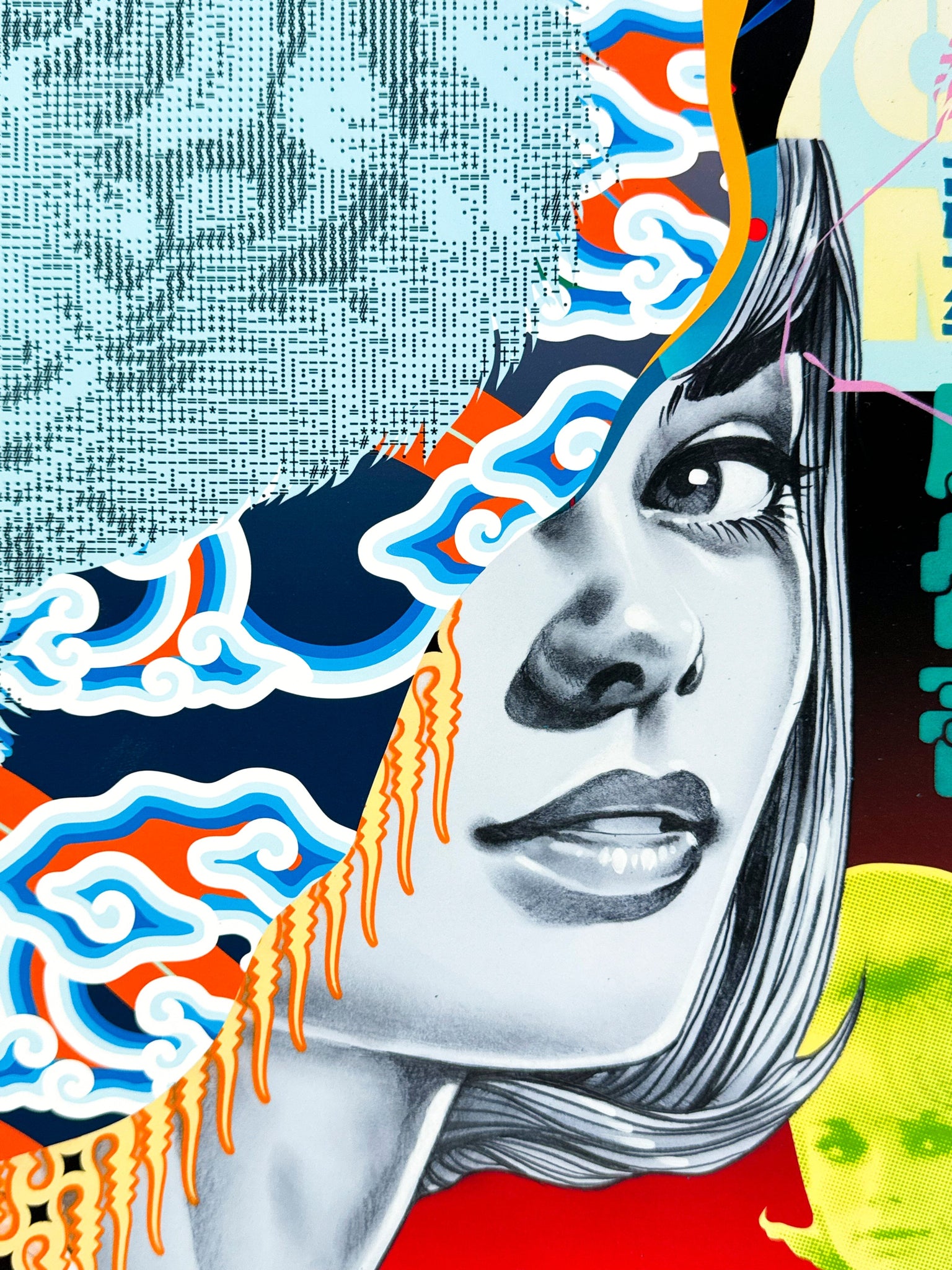 Medium: Hand-finished giclée print on 300gsm cotton rag paper. Embellishments include hand painted aerosol and spray paint.