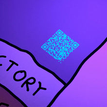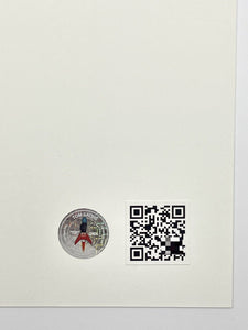 Medium: 13-colour silkscreen print with semi-gloss varnish, printed on 600gsm Somerset Tub Sized Satin paper (very thick!) and authenticated by a QR code printed in UV-light sensitive ink, a bespoke deboss, a holographic sticker, a unique QR code sticker and an individually-stamped edition number.