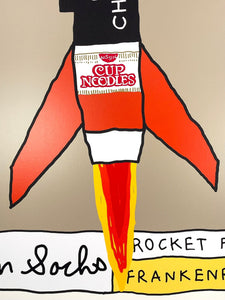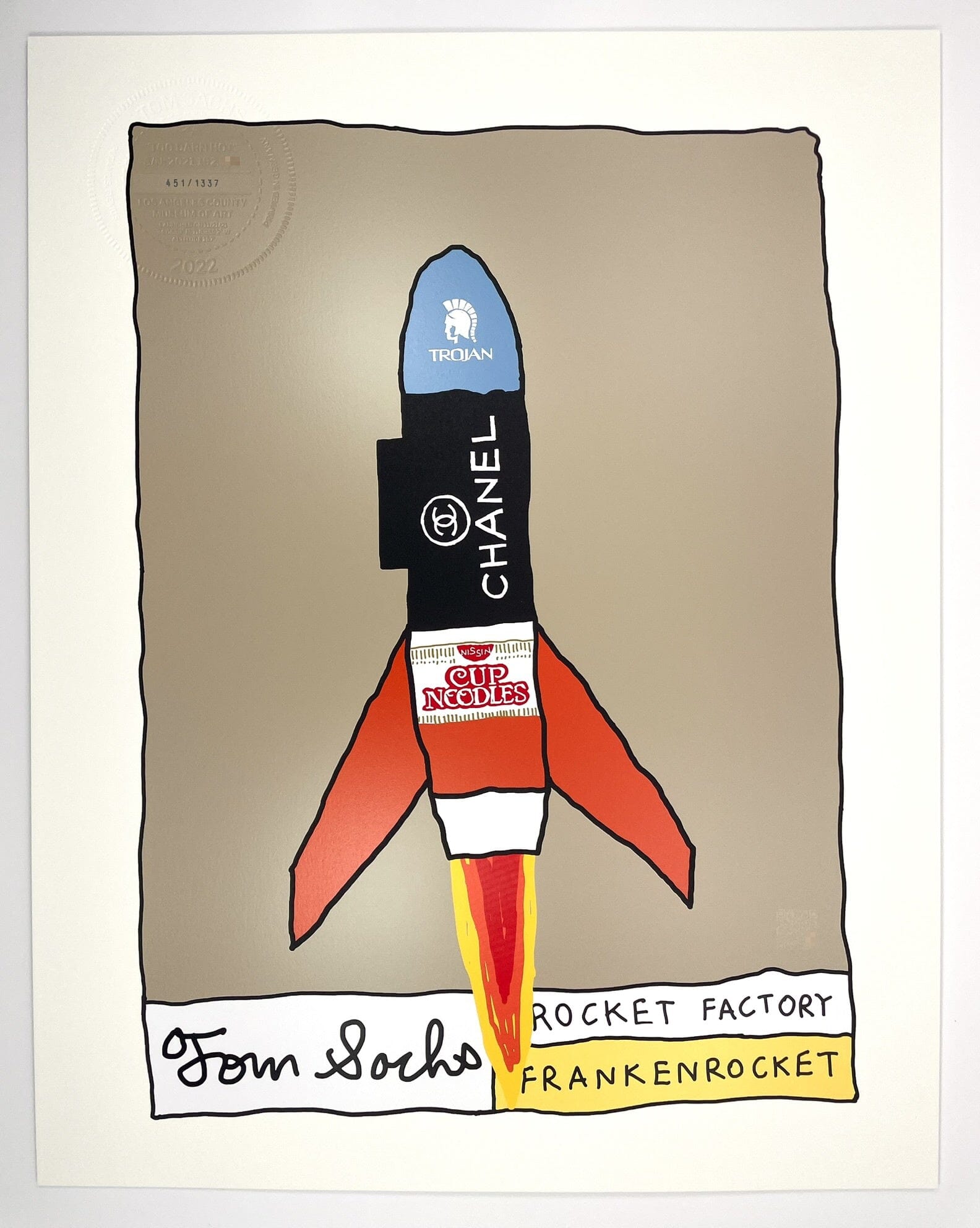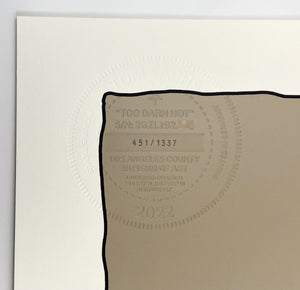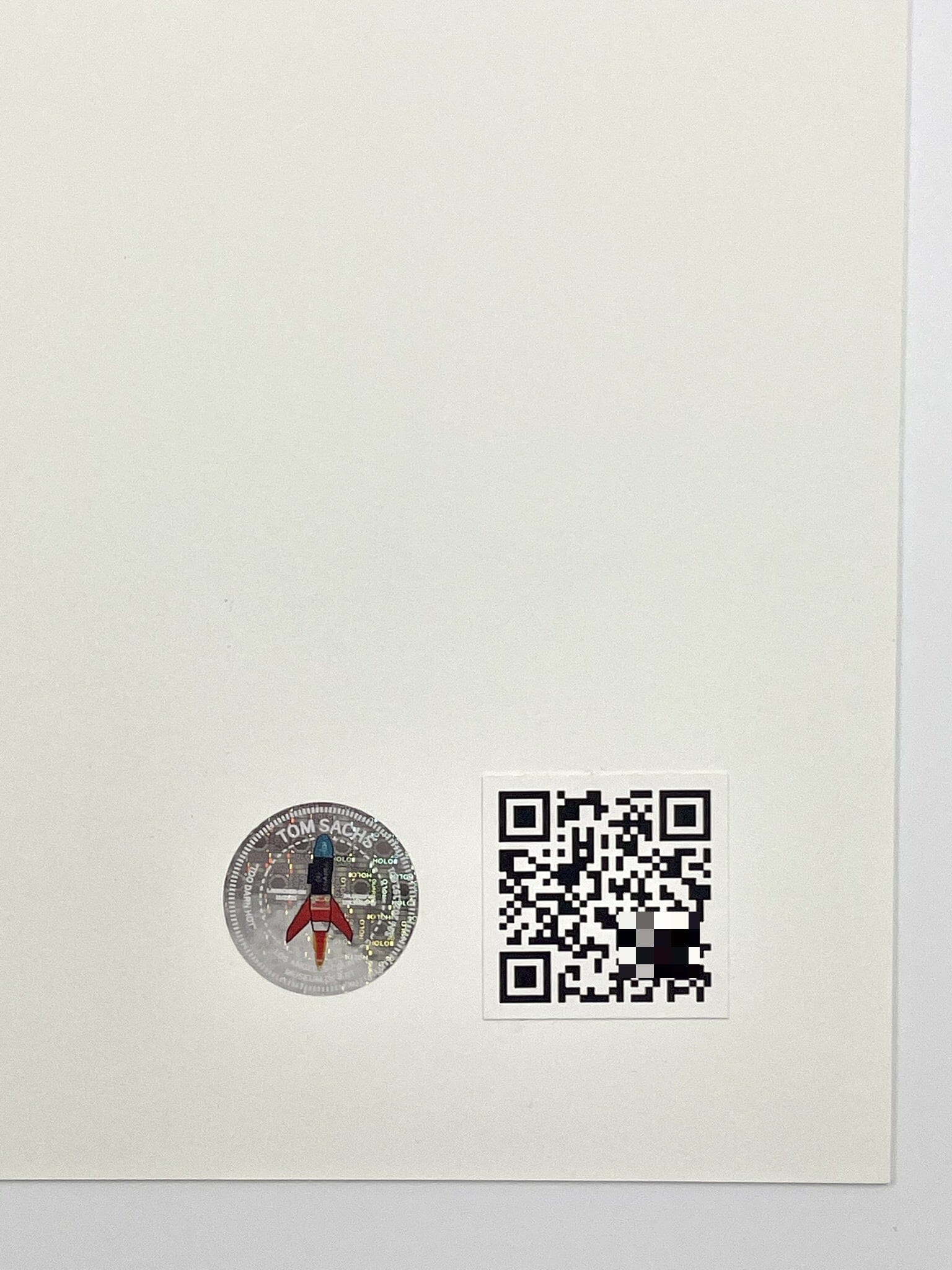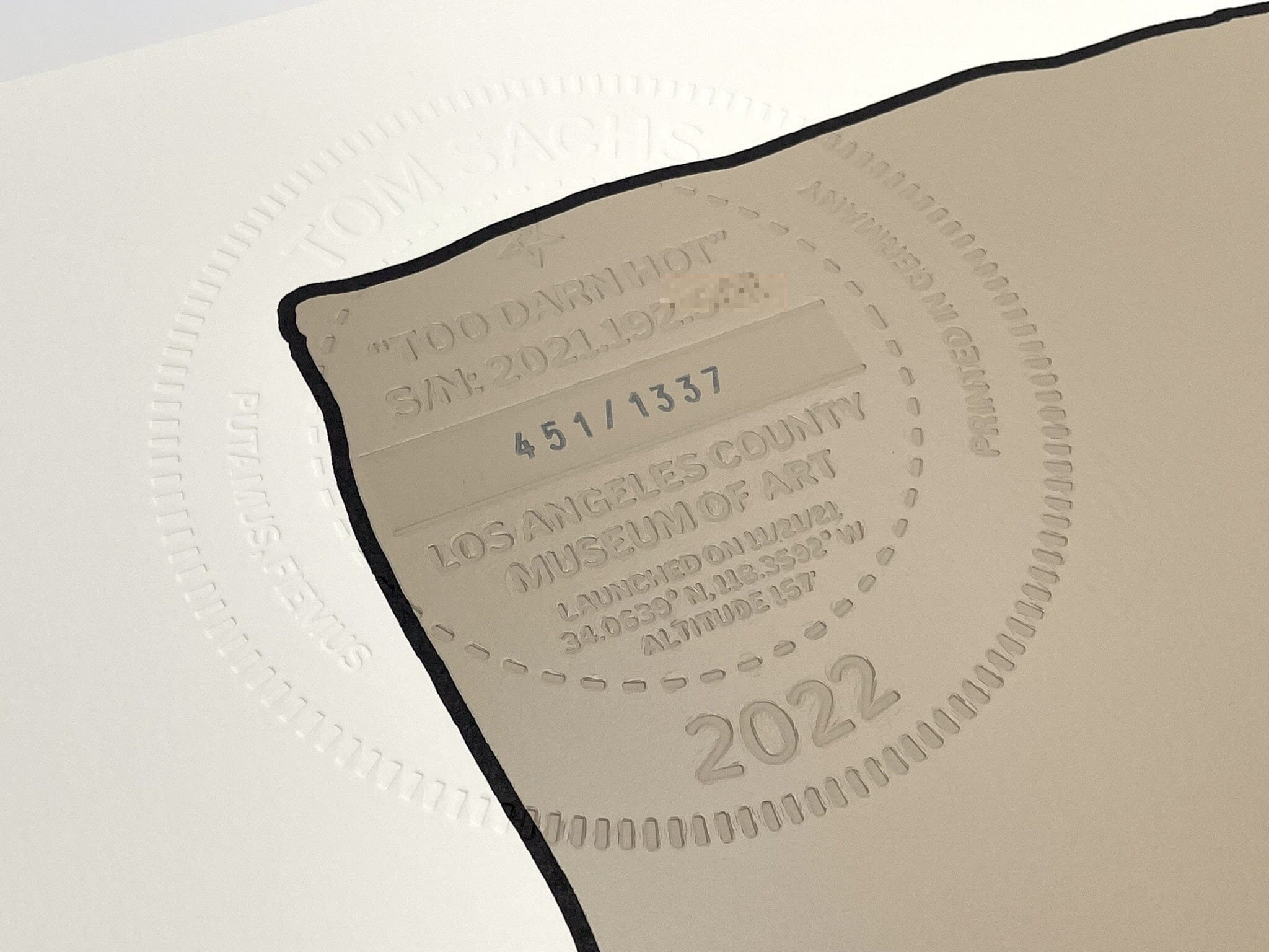 Each 13-colour silkscreen print includes a group of mechanisms conceived by the artist to establish its authenticity, and as integral parts of the artwork. A debossed design includes information from the launch of Sachs’ physical Too Darn Hot rocket at LACMA in 2021. A rubber stamp in its centre denotes the print’s specific number within the overall edition. A QR code printed in UV ink connects each print with the original Too Darn Hot NFT metadata on the blockchain. On the print’s reverse is a tamper-proof holographic sticker, placed alongside a QR code sticker that links to a unique token on the blockchain – an NFT – which serves as a certificate of authenticity for the print it connects with. A second, printed certificate of authenticity shipped with each print also links directly to this NFT.
